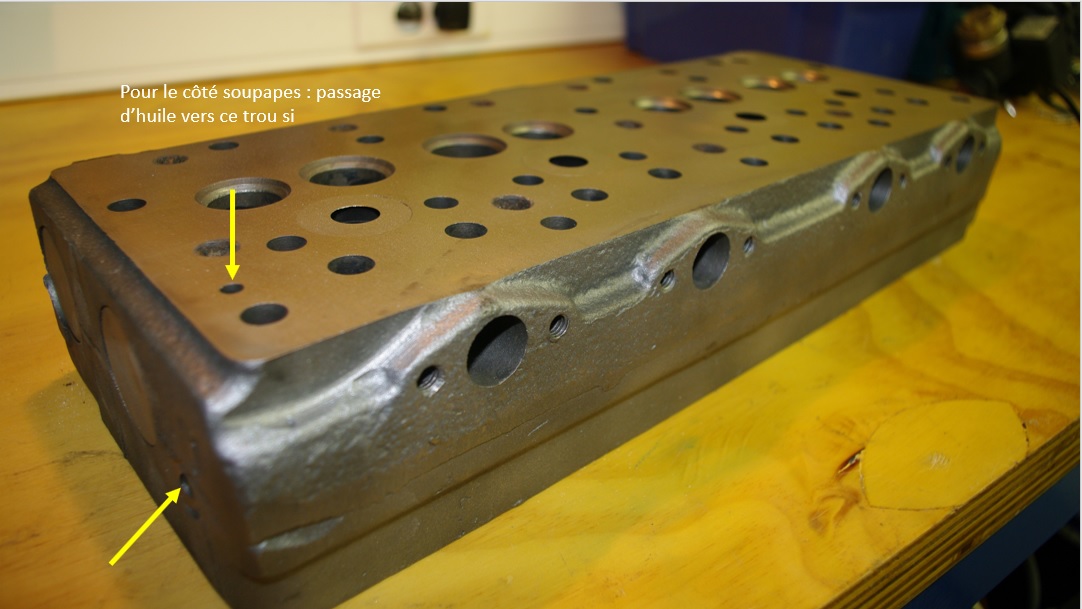 Au sujet du trou fileté à l'arrière de la culasse, si j'ai bien compris il communiquerait avec le passage huile, MAIS comment se fait l'étanchéité ? surtout que l'huile est sous pression. Sur une photo il est montré le boulon avec sa rondelle, on ne voit pas de joint ? ou filetage conique ? Ce trou, ne serait pas par hasard,lors de l'usinage, une technique de perçage horizontal rejoignant le vertical pour avoir un canal a angle droit ? peut-être impossible ou complexe à faire par moulage au coulage de la culasse, surtout en fonte.