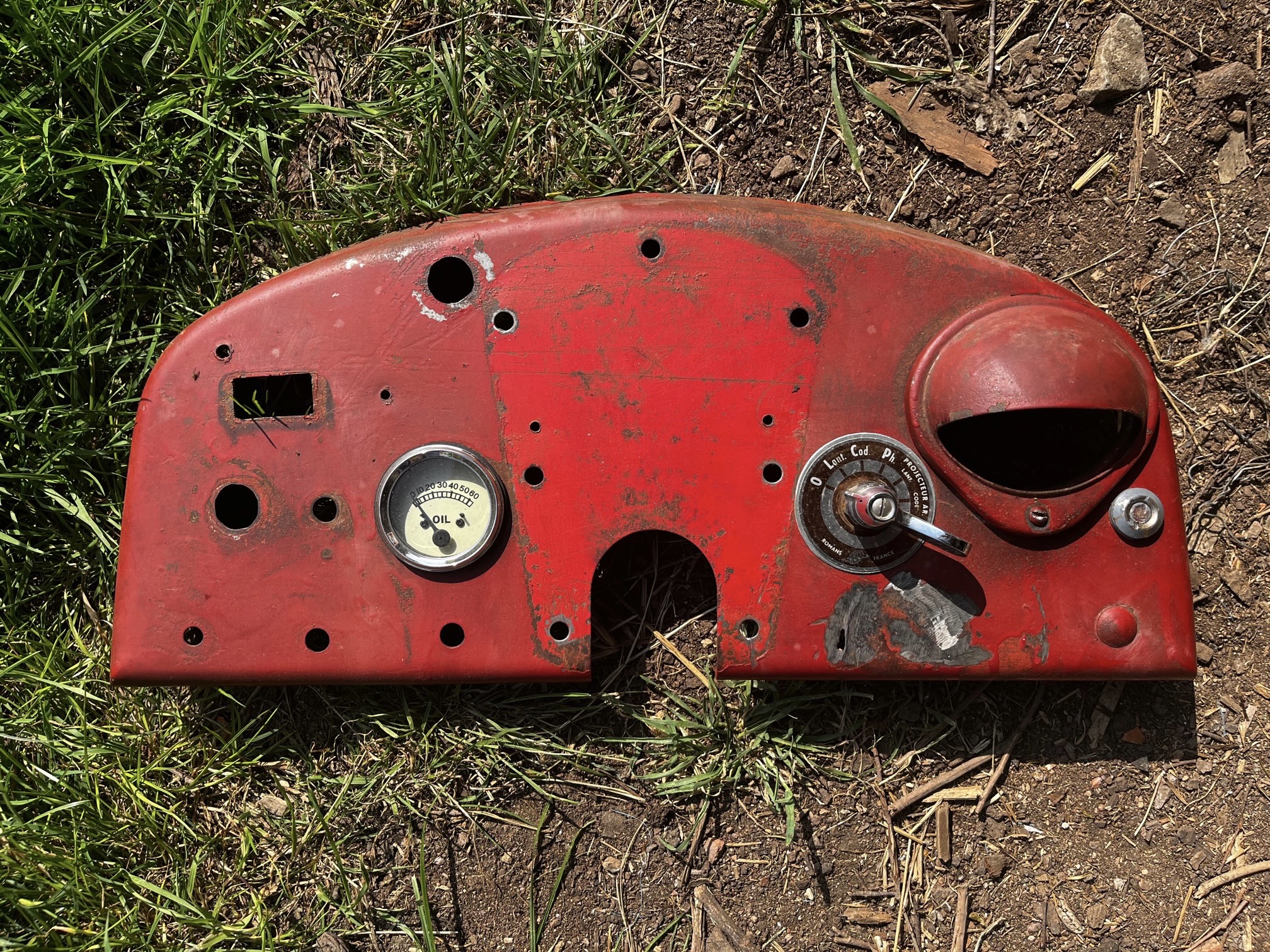 Actuellement sur le tableau de bord, j’ai sur la gauche le contact de clef, un voyant, un manomètre d’huile (Qui ne fonctionne plus car il ne bouge pas avec le moteur en fonctionnement) et des trous vides, à droite j’ai un ampèremètre, la prise d’air du filtre à air et des trous vides. Je penses qu’a l’origine, a me confirmer, il n’y a pas d’ampèremètre et à la place doit y avoir le commutateur pour l’éclairage, le bouton du klaxon à gauche du mano d’huile et le voyant doit être à droite de la prise d’air. Je n’arrive pas à quoi ressemble le tableau de bord d’un FF30GS.