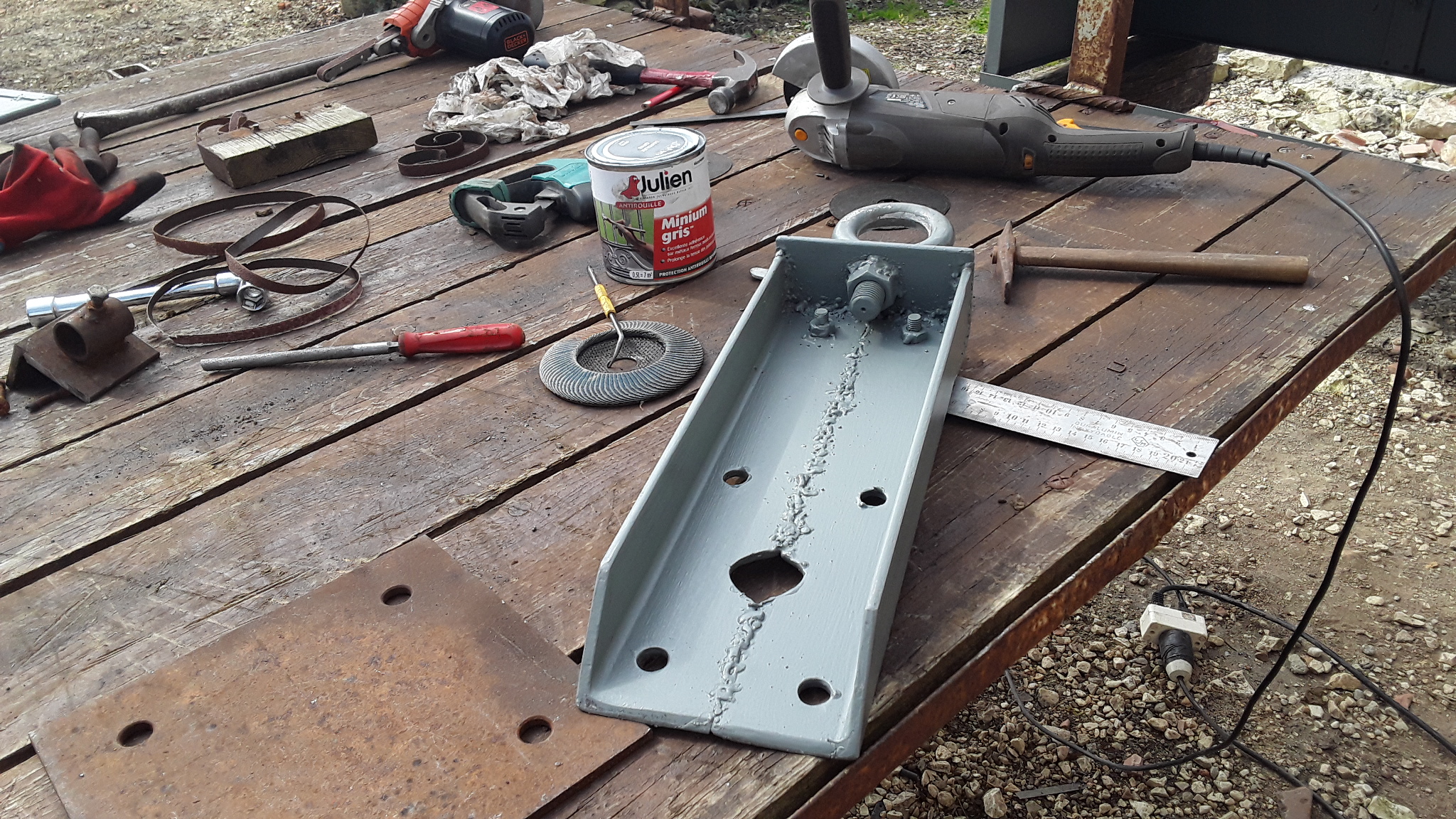Me restait de la ferraille, j'ai fabriqué un plateau en cornière avec un anneau, à fixer sous le pont, j'attends la boulonnerie et gougeons