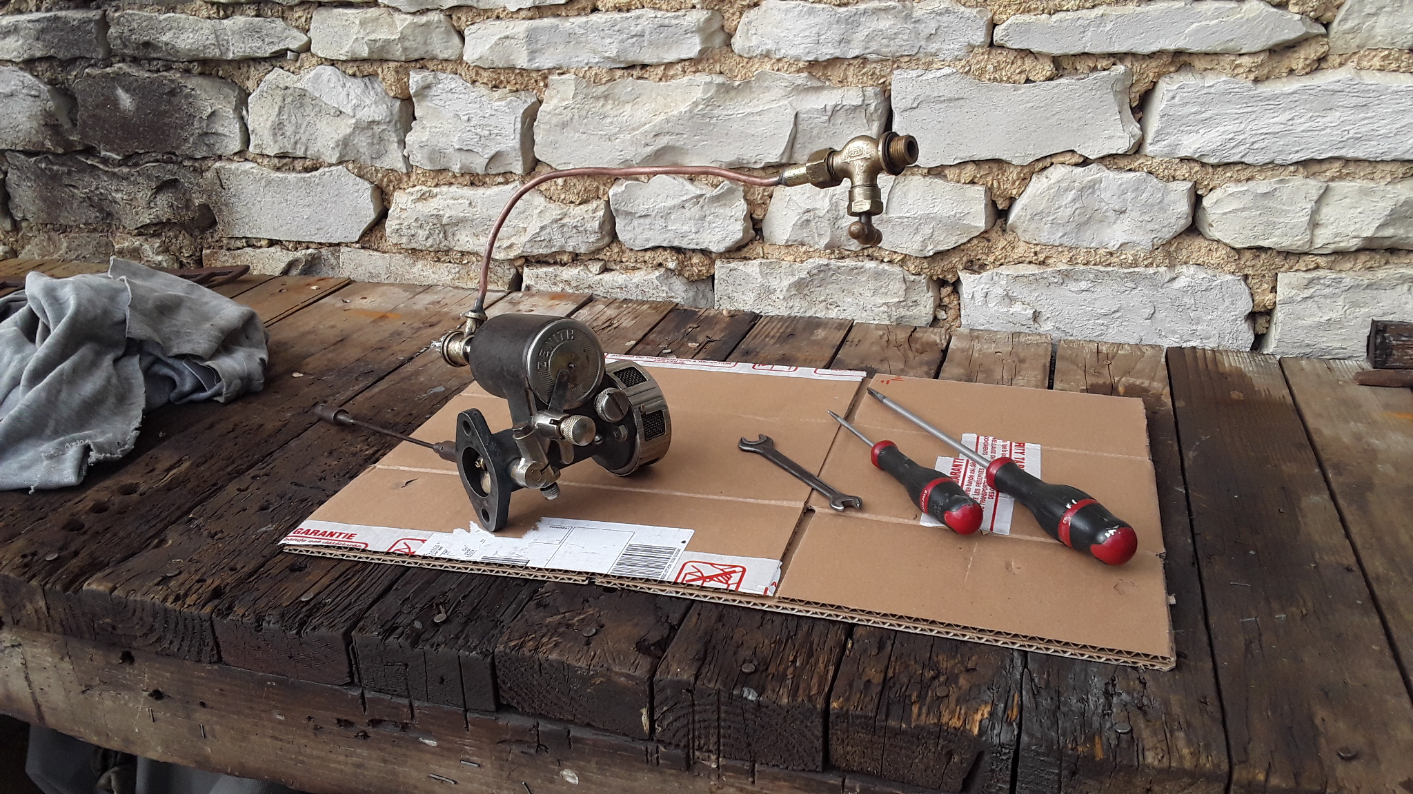 Carburateur ZENITH remonté. Le volet des gaz est manoeuvré par un levier et tige venant du régulateur situé dans bas moteur.