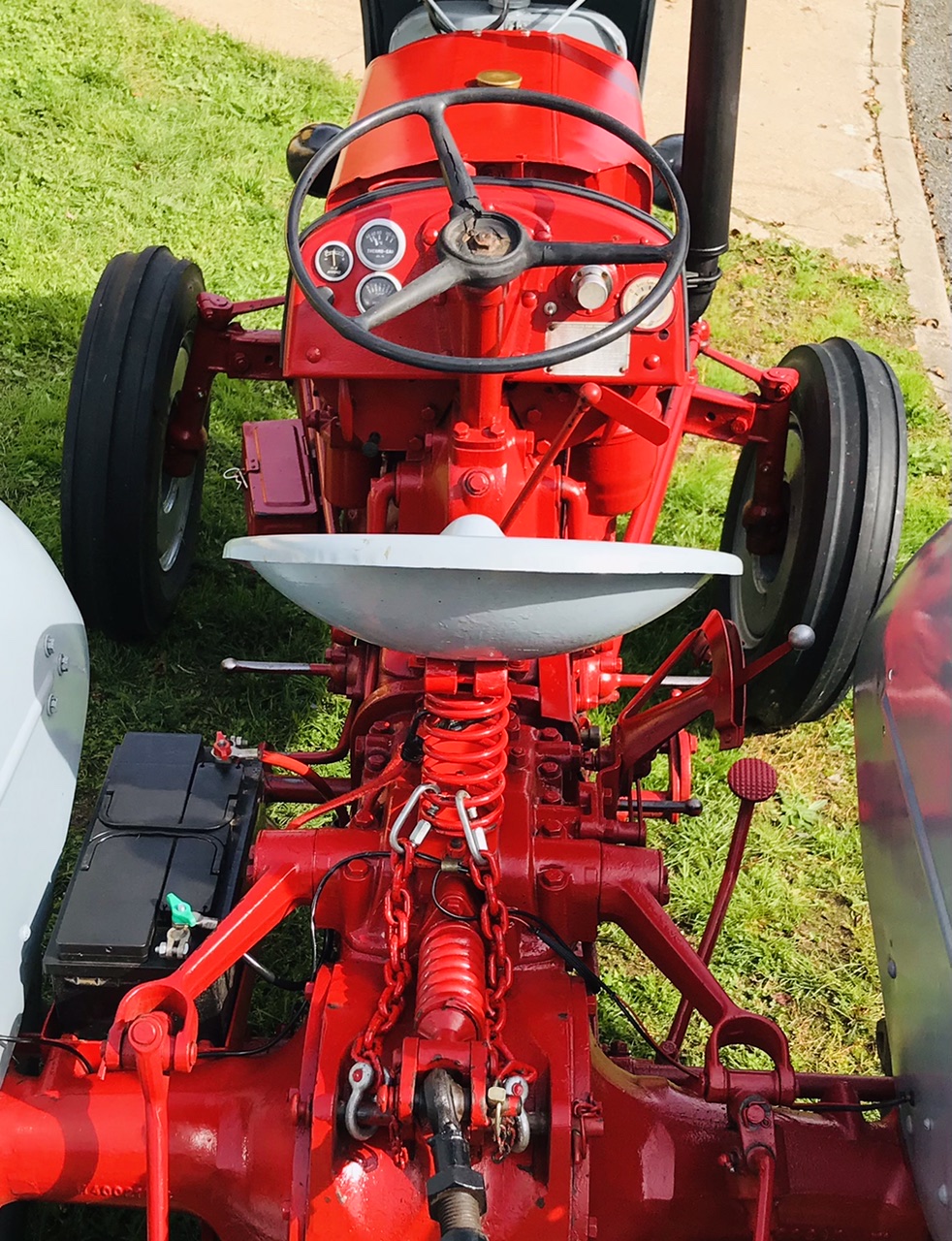 Petite remarque en observant les photos : le tracteur est équipé d'origine de chaines intérieures au bras de relevage pour limiter le débattement du matériel attelé. Compte tenu de la pente, ta tondeuse a tendance à aller du coté le plus bas, c'est la gravité, c'est une loi physique. Personnellement je trouve désagréable de sentir un matériel qui va de droite à gauche avec le risque d'accrocher si l'on a pas anticipé ce déplacement. Les tracteurs plus récents sont équipés de 'tendeurs" que l'on règle après avoir attelé pour limiter ces "balancements". J'ai installé ce genre d'accessoires sur mon TEA.