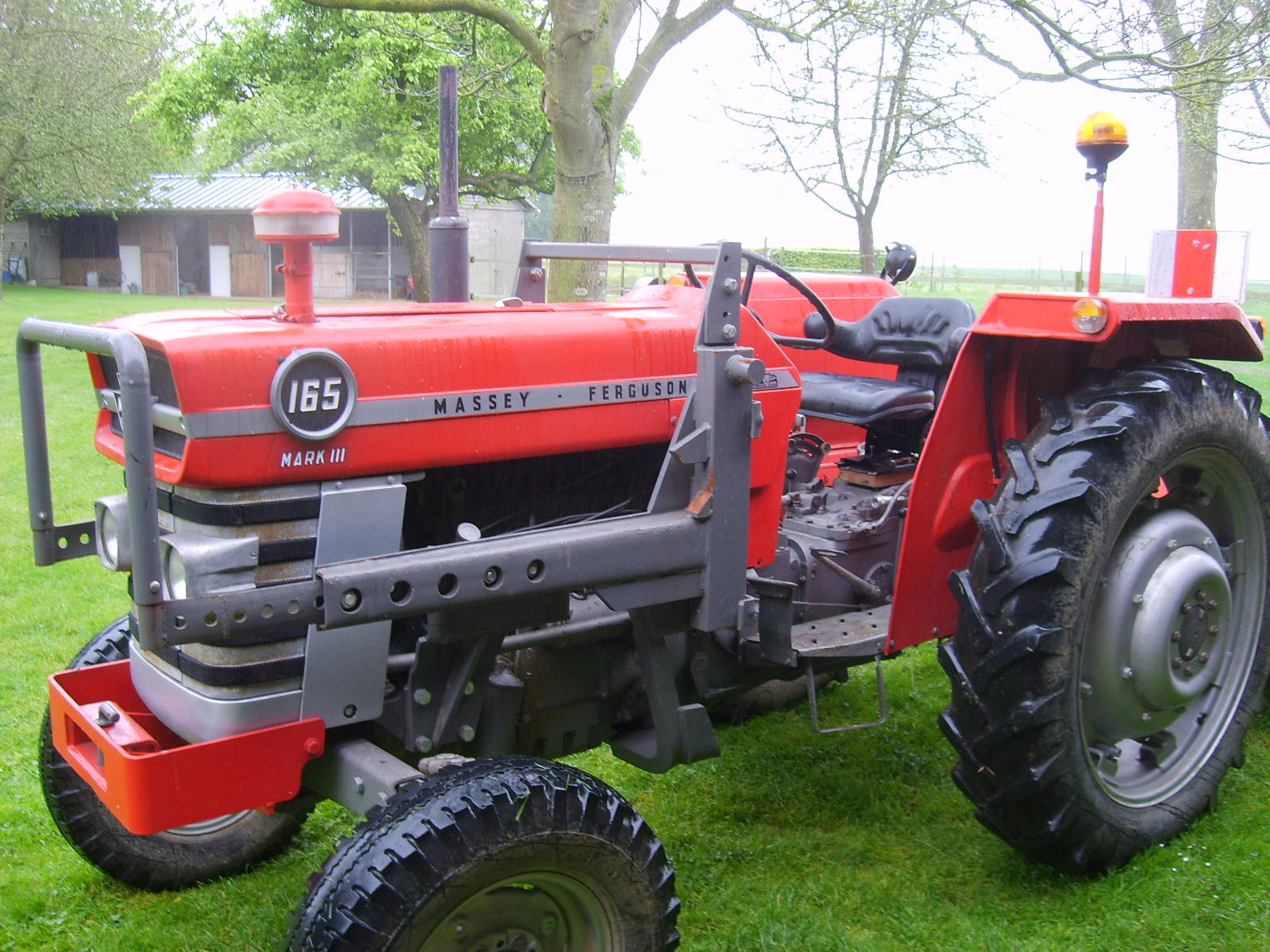 En 2012, je fais l'acquisition d'un MF 165 Mark 3 en panne depuis peu et en état moyen car la "ferme" avait besoin d'un matériel plus puissant et j'étais en retraite avec le temps qui va avec pour faire les foins et autres travaux encore sous-traités... Celui la m'a coûté cher en remise en état mécanique car il avait été bricolé. J'ai refait le moteur avec culasse neuve car trop de jeu aux guides et fuite d’huile à l’échappement, embrayage, remise en état de la pompe de relevage, réglage du relevage,freins, rotules de direction, boitier de direction,axe et bague du train avant et bien sur le faisceau électrique et les équipement qui vont avec. Au niveau de la carrosserie seules les ailes sont neuves. Comme le 37 après avoir été remis en état mécanique il a été démonté pour être repeint pièces par pièces et équipé d'une fourche achetée 150 € qui a été complètement reconditionnée (vérins et axes neufs) et repeinte. Elle a fait le sujet d'un post "Modification relevage".