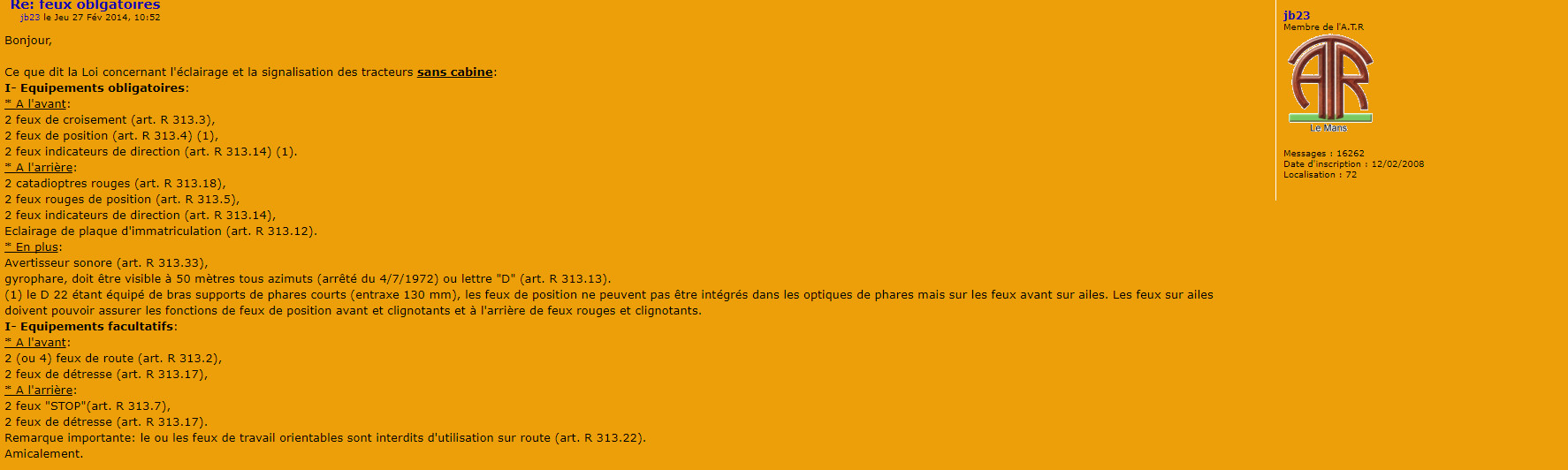 OK, donc si pas de stops sur le tracteur a sa sortie et homologation, pas d'obligation d'en mettre maintenant, a moins bien sur, je pense si entre temps un décret code de la route les rends obligatoire a partir de ... Actuellement pour les stops pas d'obligation ! si bien sur il n'y étaient pas a l'origine a la sortie du tracteur. Bien compris. mercib