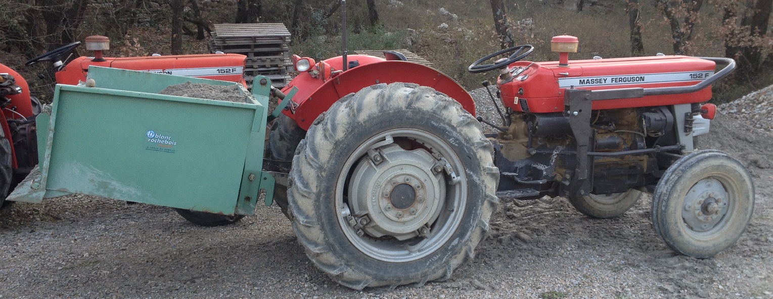 chargement de tout venant sur la bennette 3 points à la limite de l'équilibre du tracteur. souvent sur 2 roues avec les nids de poules sur la routes!!