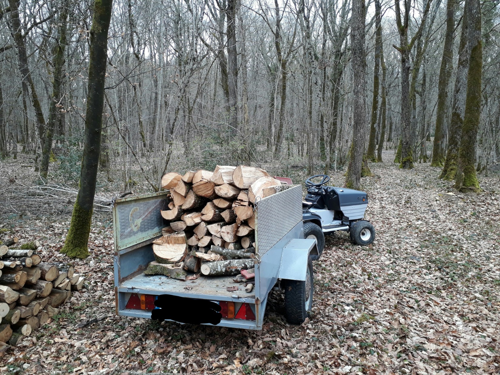 Obligé de prendre le MURRAY pour rapprocher le bois du chemin d'accès. Le TEA et la remorque ne passait pas dans l'allée, 3 petits chênes dans le milieu, moins de 25 cm à 1m30 du sol pas le droit d'y toucher ( ONF )