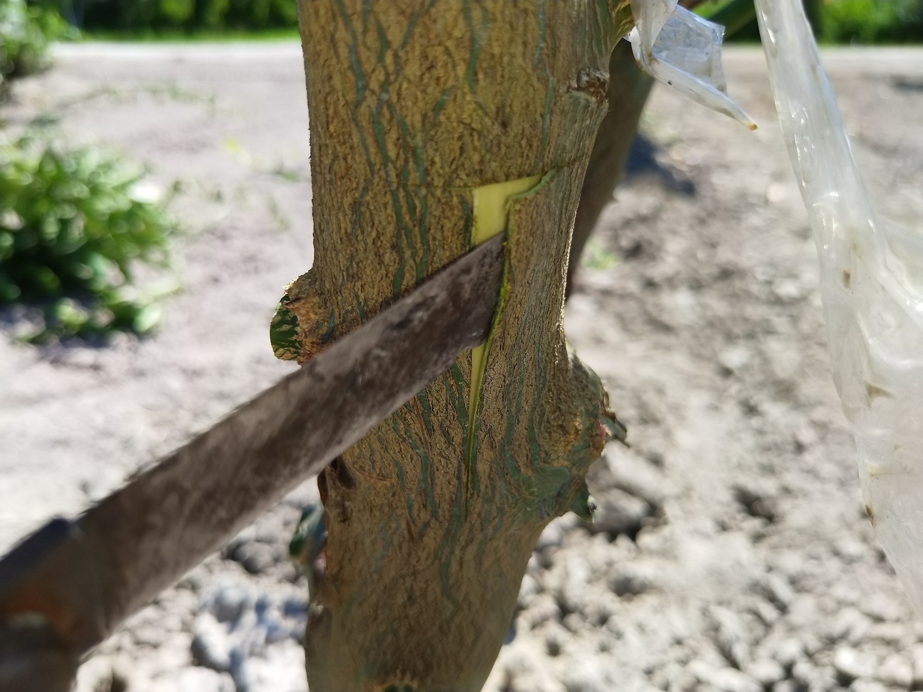Ensuite avec le greffoir j'ai fait une incision en T pour pouvoir glisser l'oeil de l'oranger a l'intérieur
