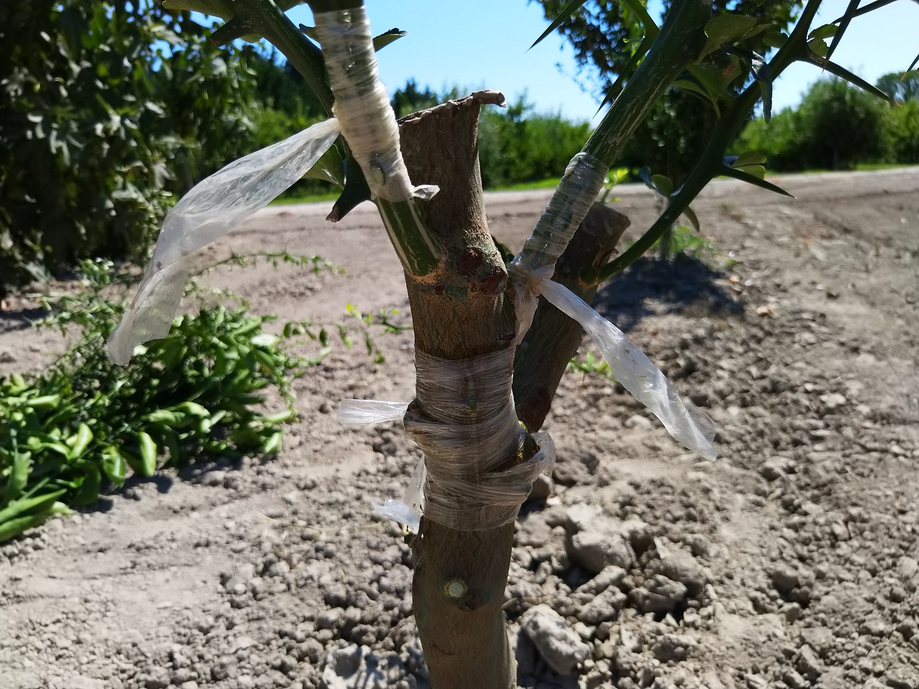 Et on emballe le tout avec un bandage specifique du style "raphia" pour eviter que la greffe ne prenne l'air et se dessèche !