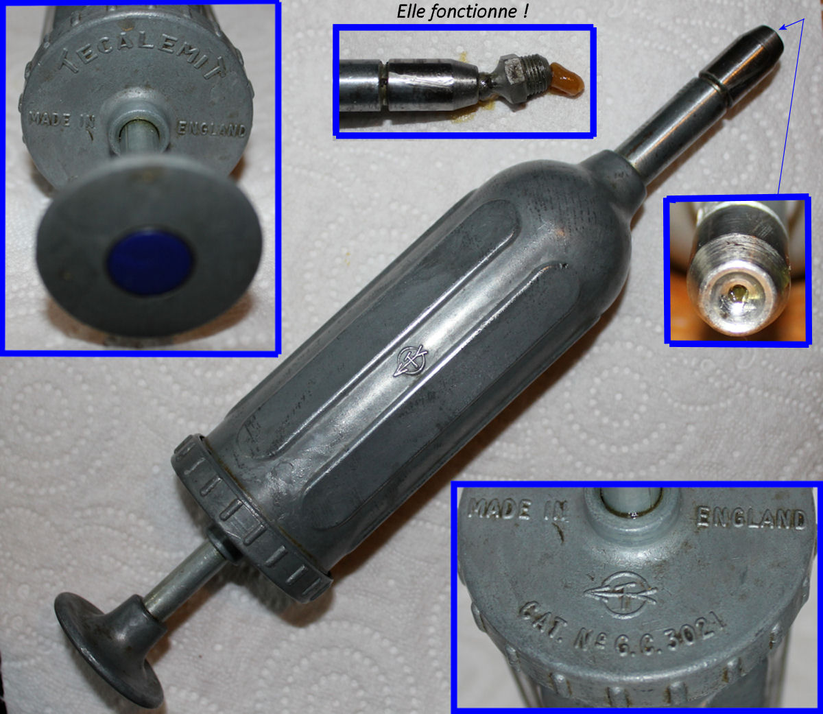 Après la (les) clé (s) (déjà présentées sur un autre post) Il y a une pompe à graisse spécifique, j’ai trouvé celle qui correspond aux descriptions donné sur divers sites et vraisemblablement utilisée pour d’autres tracteurs anglais et aussi certaines voitures, Triumph, Jaguar….