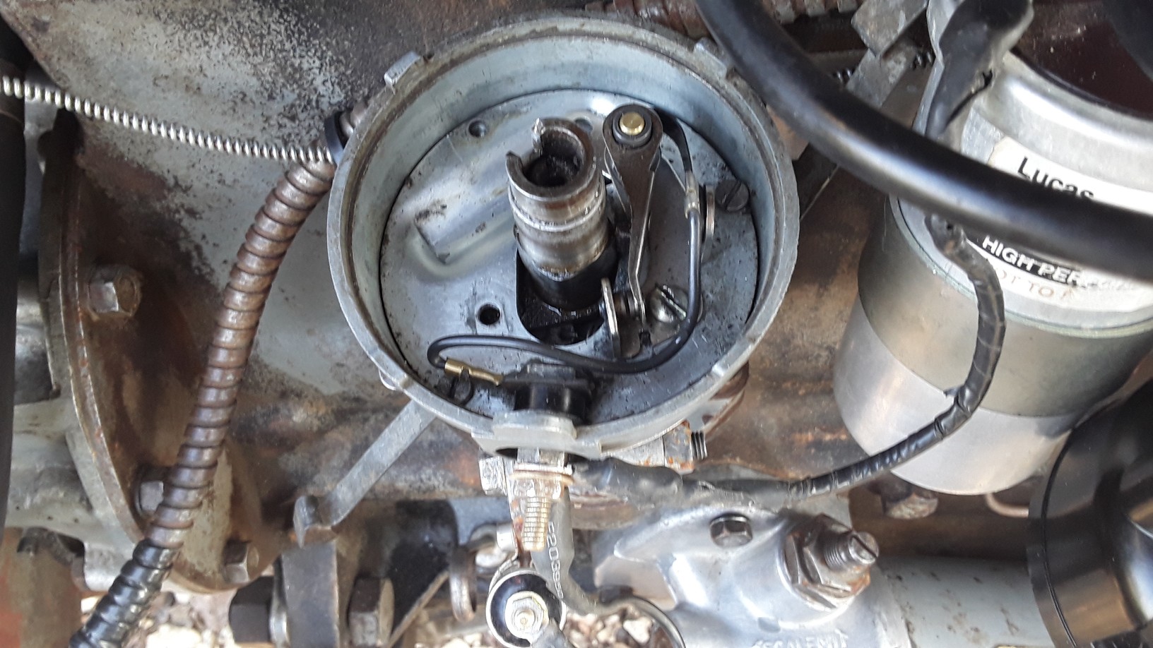 Regardé cet après-midi, pas trouvé de rupture courant vers l'allumage. Le contrôle lampe témoin n'a rien révélé sur une coupure du circuit entre batterie/contact/bobine/bougie. A voir si condo ou bobine trop faible. Faut dire que tout est neuf, env 12 à 15 mois, d'après les dires, un condo peut lâcher à tout moment, si c'est que ça. Le condensateur, je sais pas comment le tester, vais démonter mon allumeur, peut-être un blem à l'interieur, c'est un LUCAS D3 A4 les vis platinées sont pas des lucas ! Vais enlever le plateau porte vis platinées et condo pour voir si au niveau masselotes/resorts tout est normal. Une question l'axe porte rotor il a un jeu axial c'est normal ? on le tourne à la main sur env 2 à 3 mm je pense à un jeu de rattrapage, cet axe il est attaché aux ressort ou il bouge librement ? Je n'ai pas de docs sur ce sujet, vu quelques éclatés sur le net, mais pas facile de voir si on n'a pas déjà démonté ce genre d'allumeur. Si parmi vous quelqu'un à démonté ou sait comment est fait un LUCAS, ou un éclaté, je suis preneur.