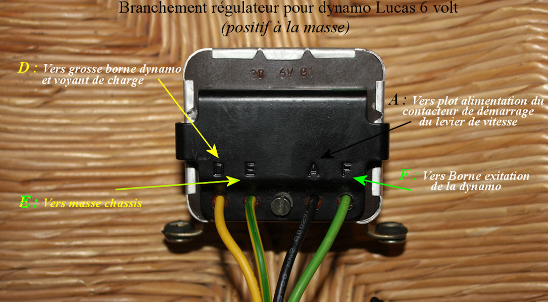 - de l'autre doit arriver la masse. Le fil qui part de ce côté va à une borne du régulateur (borne D) et puis directement aussi à la dynamo. La dynamo ne peut donner ne masse correcte car résistance interne des bobinages trop importante.( rectif ci-dessous) Donc c'est la borne du régulateur qui doit être à la masse à ce moment.( elle passe à 6v quand la dynamo tourne) Ce point est à vérifier... A propos la borne E c'est la masse sur le régulateur. Vérifie si tu as une bonne masse à cette borne.