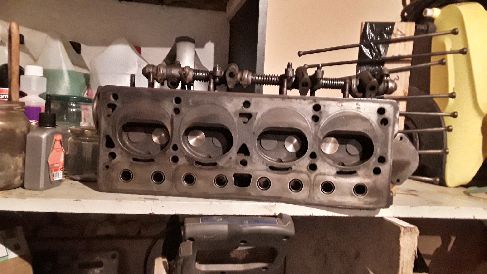 Ça a avancé dans la préparation du bas moteur et culasse. J'ai nettoyé les pistons et le plan de joint, j'ai fini la culasse, rodage des soupapes, vérifier la planeité, pas de problème de ce côté, pas de défaut visible à la reglette. Je suis à l'extérieur, donc pour le remontage oups ! pas très beau cette semaine.