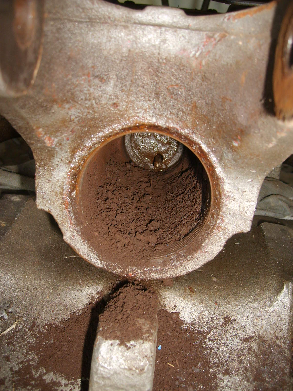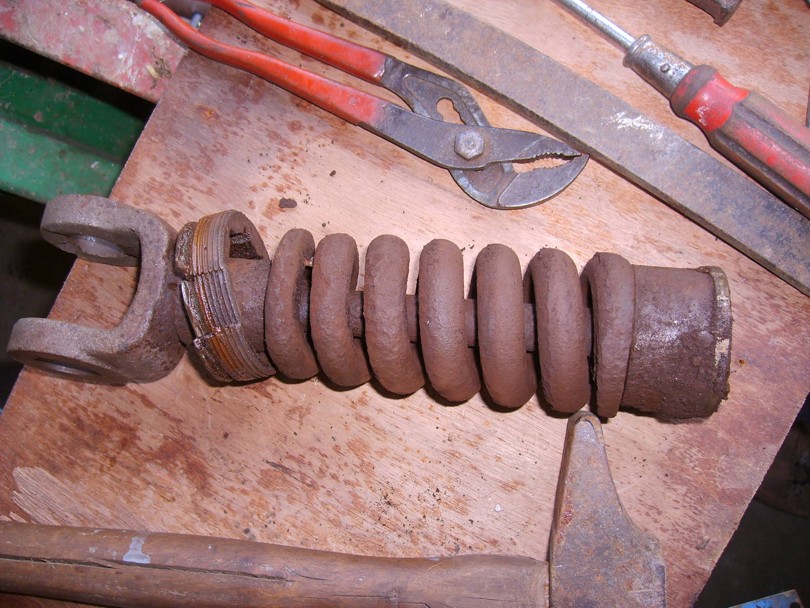 L'écrou n'est pas très rouillé par contre comme on le voit sur la photo, le logement pour le ressort en bien rempli de terre qui doit provenir du travail du sol en condition poussiéreuse. Pourtant le cache caoutchouc étai encore existant et plutôt en bon état pour son âge mais la poussière cela s'infiltre partout. Rajouter un peu d'eau de pluie ou de lavage et voila le résultat car l'ensemble a été dur à extraire.