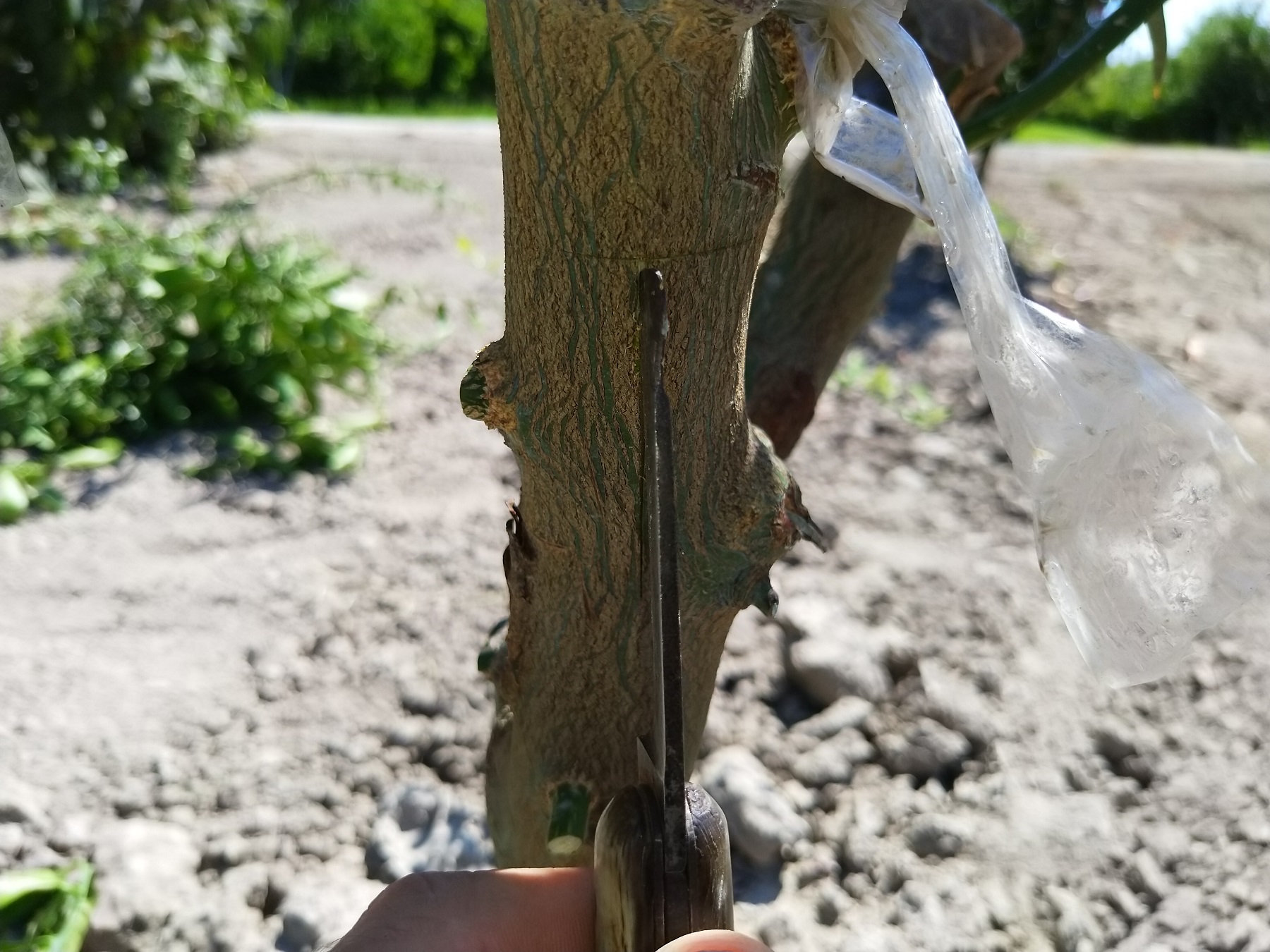 Ensuite avec le greffoir j'ai fait une incision en T pour pouvoir glisser l'oeil de l'oranger a l'intérieur