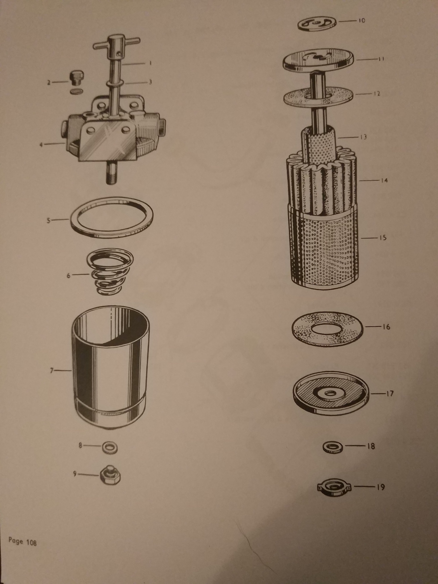 Le bricoleur qui fit ce montage complètement idiot à oublié de poser, sur les deux filtres, les coupelles 17, la rondelle d'étanchéité 18, la vis de serrage 19, les joints 16 et 12, la coupelle supérieure 11 et son joint 10.