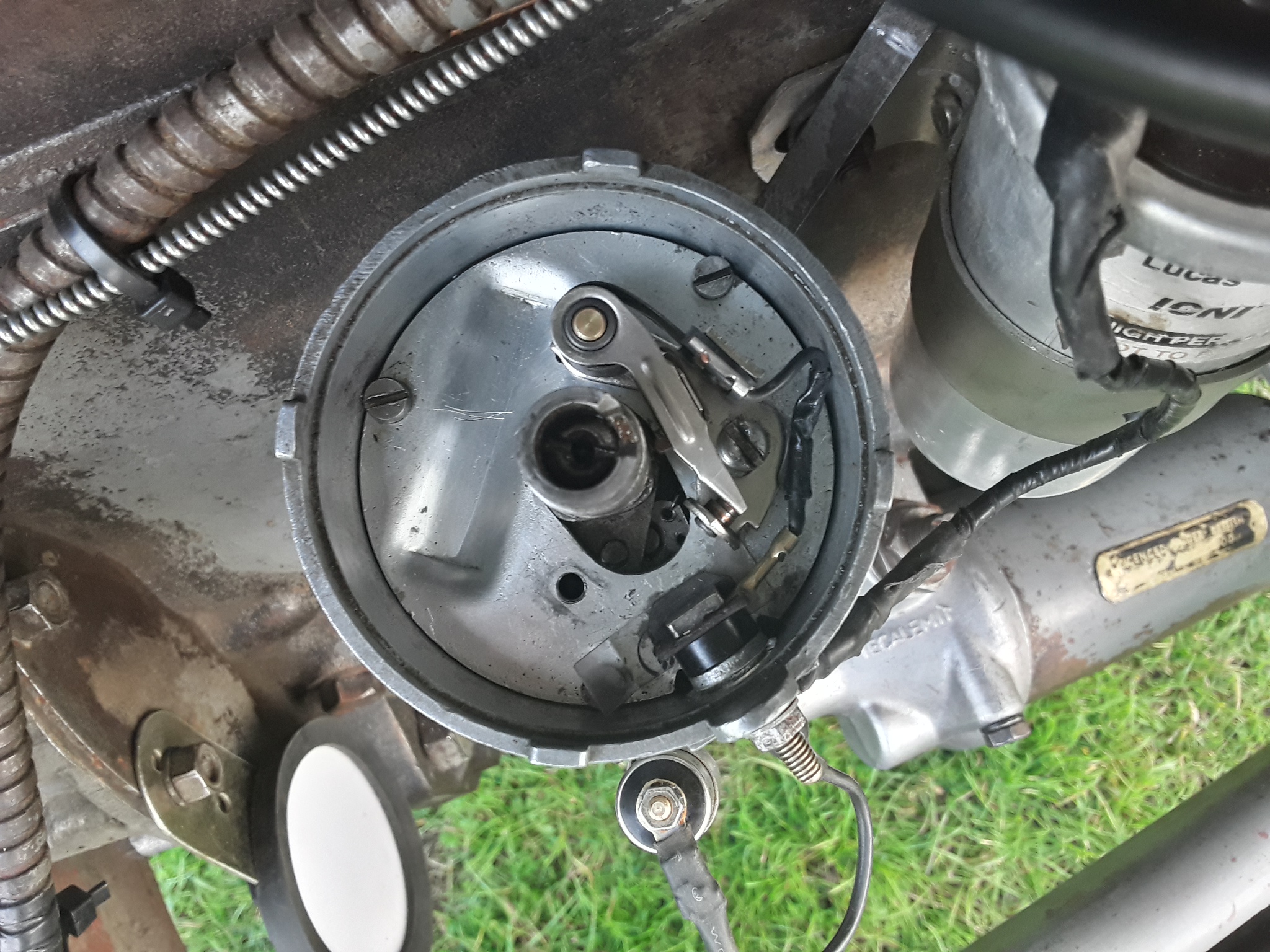 Te mets l'intérieur de mon allumeur LUCAS attention, ce n'est pas le rupteur origine, bricolage de l'ancien proprio, plaque origine, mais il a percé pour mettre un rupteur standard. Suite à ma panne indiqué plus haut, tu pourras remarquer le petit carré plastique mis sous la pièce carré en métal. Touchait l'intérieur et de là mauvais contact, pas beaucoup de jeu entre les 2 parties.