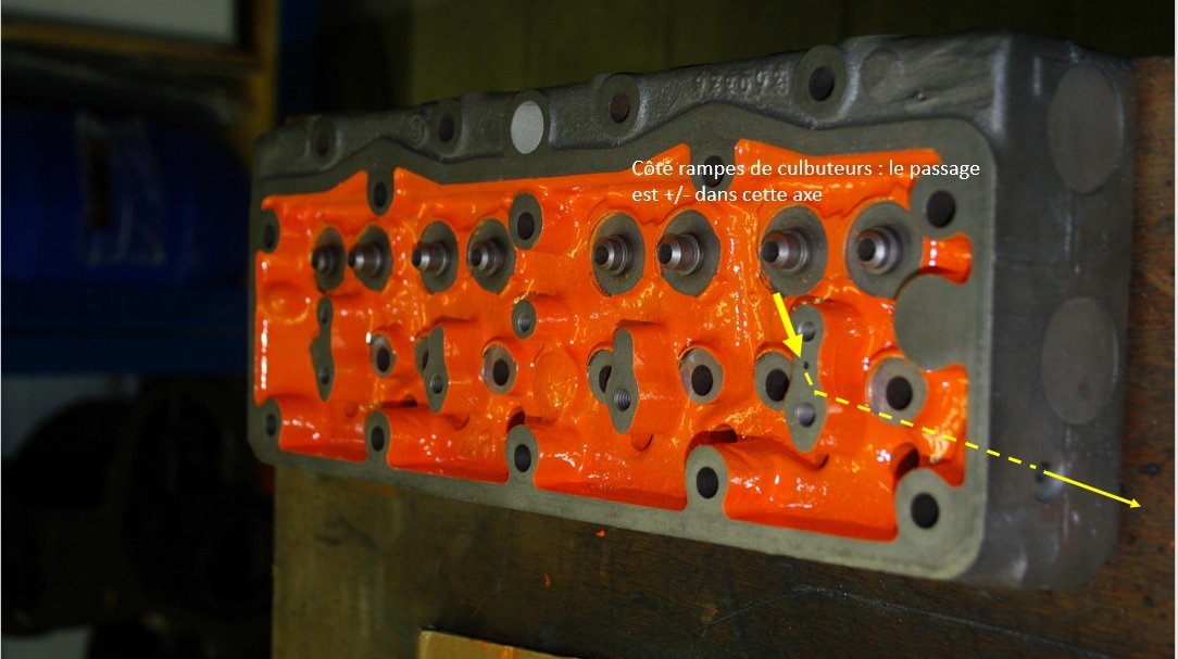 Le perçage est en diagonal de l'extérieur vers la petite sortie côté culbuteur et celle-ci est forée en diagonal pour rejoindre le premier perçage.