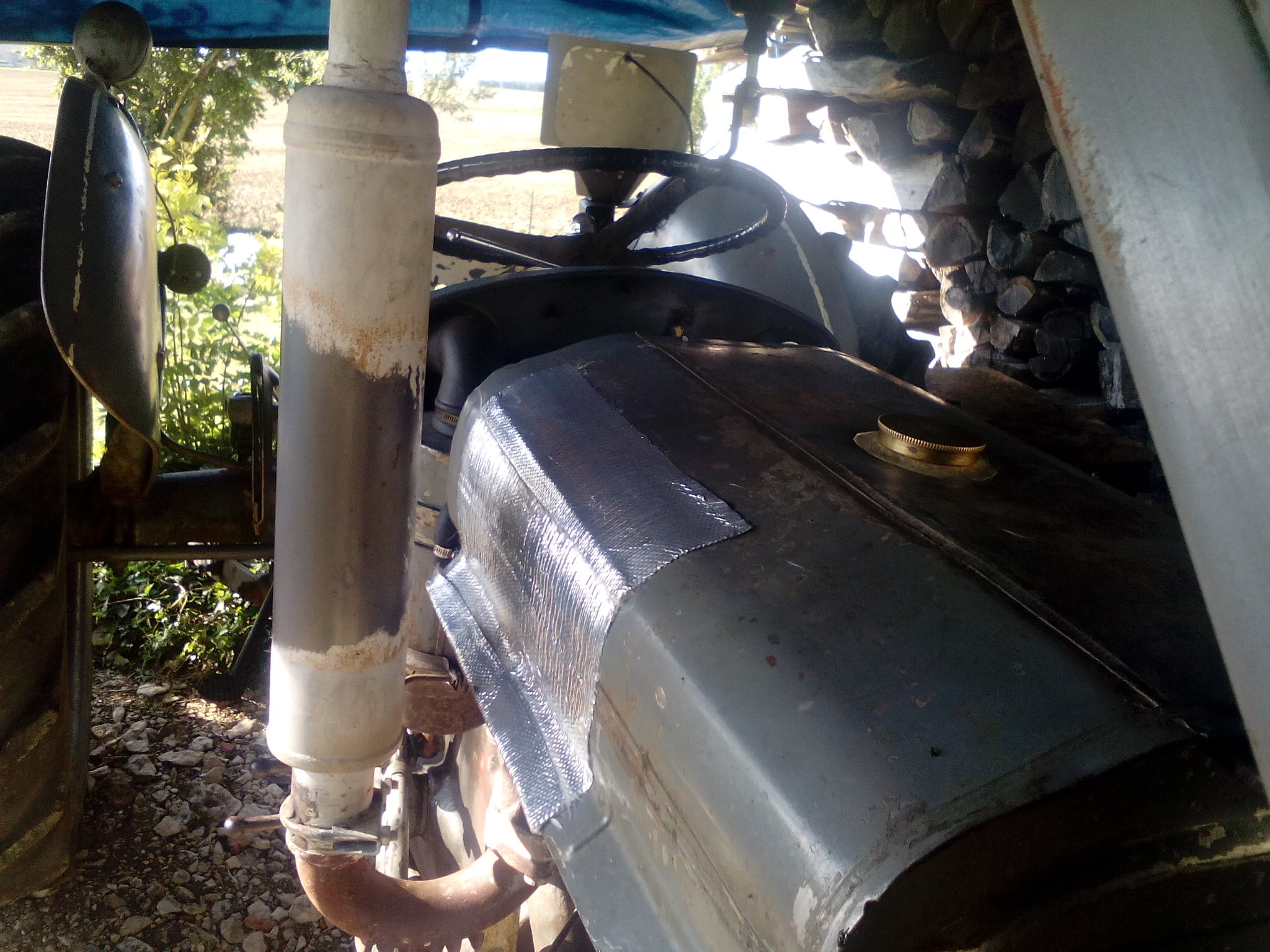 Je vous envoie les photos des plaques anti chaleur mises pour éviter au réservoir de trop chauffer. On voit que l'espace entre le pot et le capot n'est pas large, ça toucherait presque. L'idéal aurait été d'en mettre sur le capot ext près du silencieux échappement. Je n'ai pas eu de réponse pour savoir si c'est généralisé sur les TEA pot vertical, ou si c'est un blem perso a mon tracteur. Bizarre car c'est du standard comme montage, pas de transformation dans la sortie des gaz, ce que j'ai monté se vend partout. Je vais voir si ça atténué, en principe c'est fait pour !!