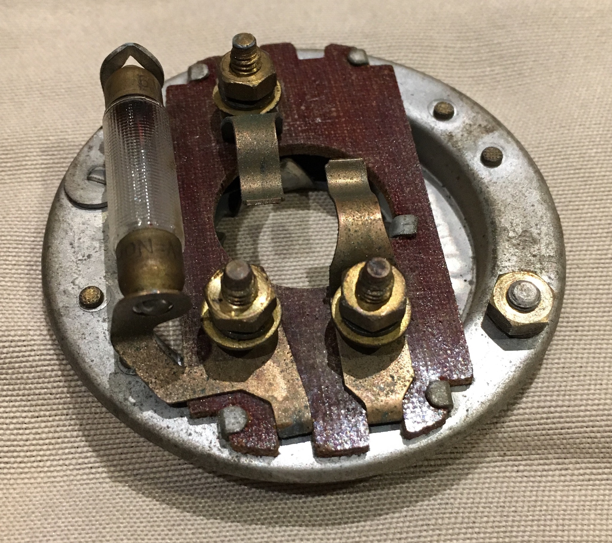 Le ff30 fonctionne en 12v (2 batteries de 6v en série, à l’origine). Cependant, dans les phares, j’ai trouvé des ampoules bi-filaments 6v-36/45W (Norma d’un côté et Sully de l’autre), ainsi que des fusibles « 6v Norma M7 » d’aspect tout à fait ancien. Les deux fusibles sont grillés ainsi que les filaments les plus fins (codes?) sur les deux ampoules (gris filaments ok).