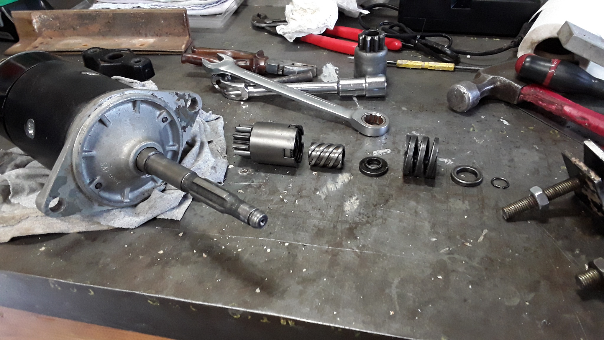 Remplacement du pignon de lancement démarreur Lucas à lanceur "bendix" TEA20 N'ayant pas les outils nécessaires, fabriqué un " système " pour sortir les éléments du pignon. Le ressort est très dur a comprimer, aucune prise autour de celui-ci, ressort et ensemble sont bloqués par un anneau rond pris dans une rainure et rondelle creuse, le tout poussé par le ressort se bloque.