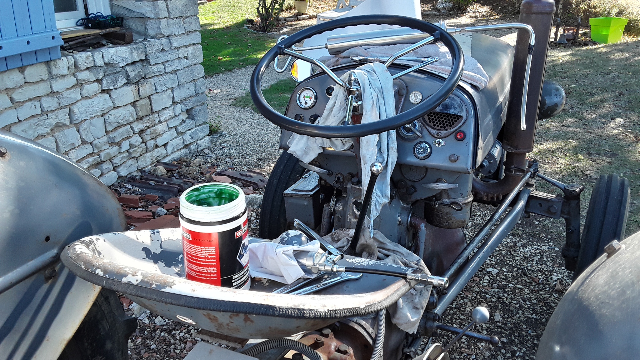 La grosse seringue sur le capot, c'était pour sortir l'huile du carter direction, un pote me l'a prêté, elle servait en atelier ou on montait les châssis de char Leclerc à bourges, autant dire que c'est de la qualité ! La petite pompe, c'est pour mon graissage, m'en suis servi pour pousser la graisse au fond du carter, après bourré par l'orifice. Sur que c'est aussi bien que l'huile, du moins plus pratique pour l'étanchéité, même chose sur les moyeux AV c'est aussi par économie d'achat de joints et autres, je l'avoue, c'est pas le prix des joints, mais tu sais comme moi, que sur nos vieux fergies, quand tu changes 1 pièce, tu te retrouves à changer ce qu'il y a autour !! PAS toucher si ça va lol