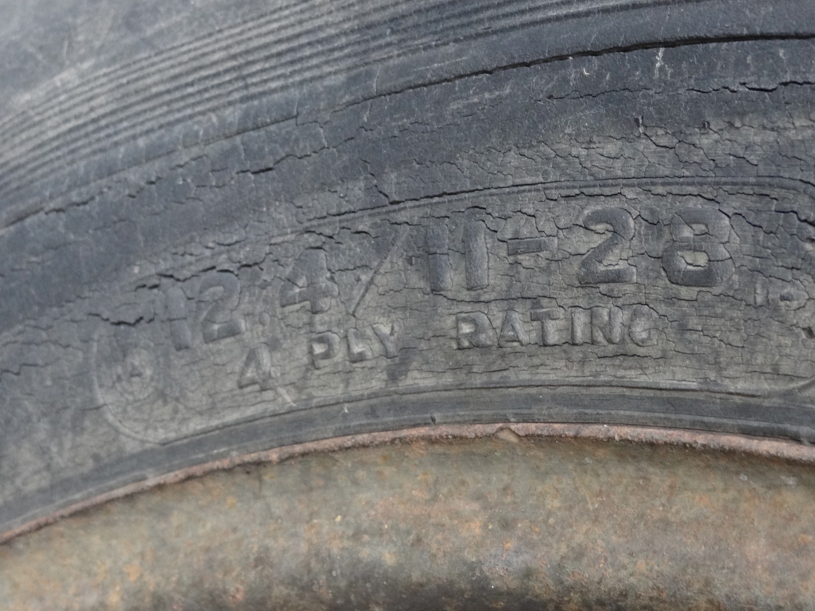 Sur mes pneus arrières, il est inscrit : 12,4/11-28 -4 fly rating Good Year. Je pense que 12,4 est la largeur du pneu en pouces, 11 la largeur de la jante toujours en pouces et 28 son diamètre encore en pouces.