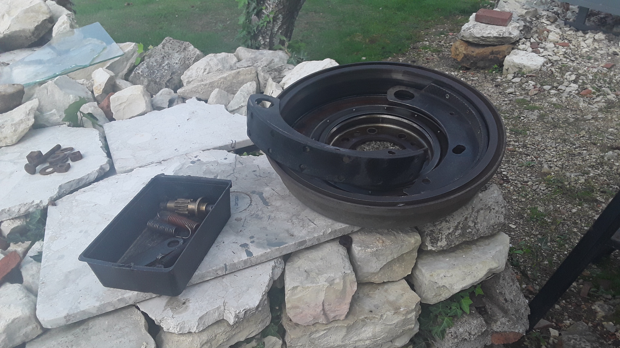 Tambour et machoire/garniture huileuses, changement de garniture à rivetée, tout de même encollée avant.