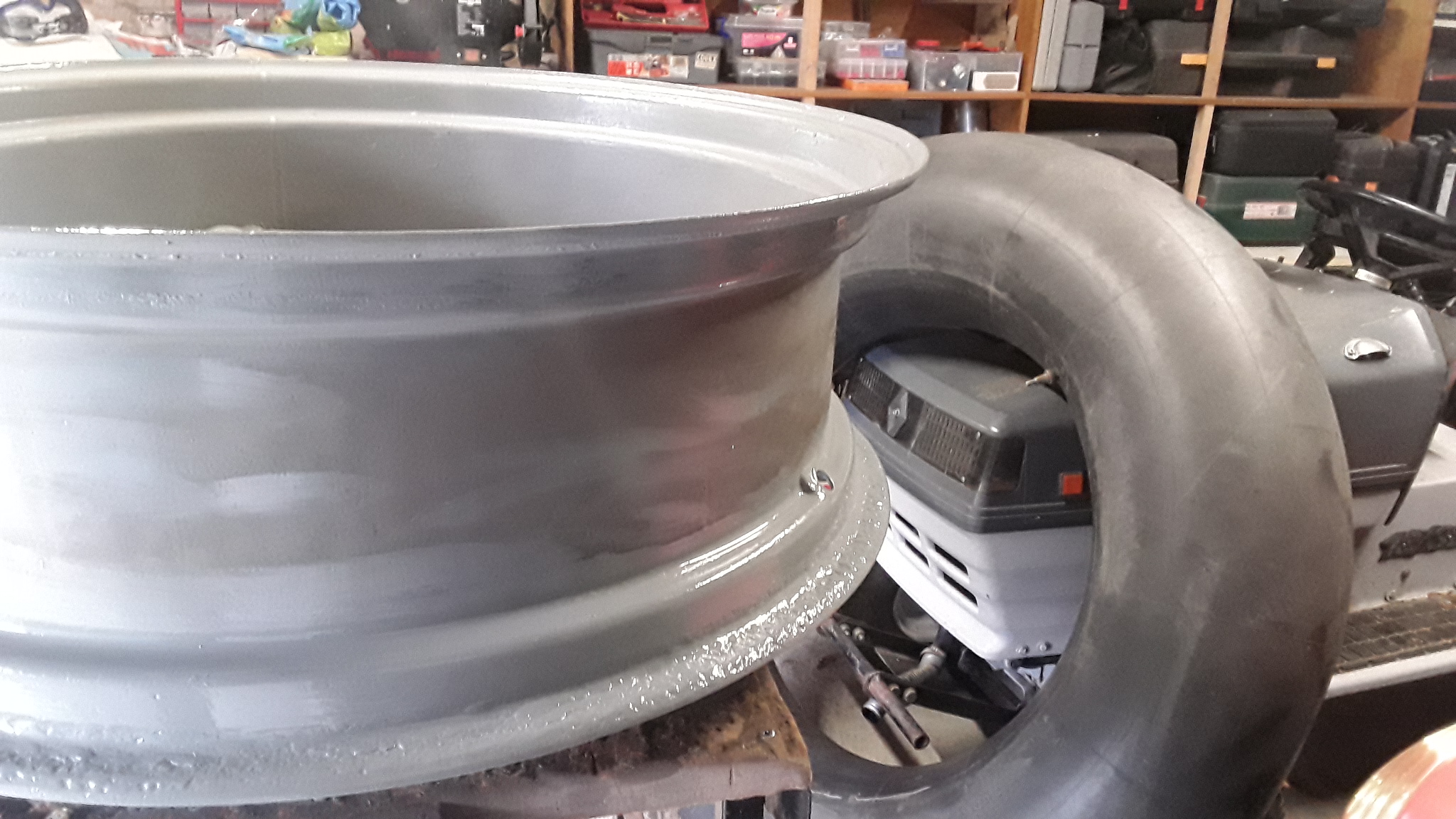C'est fait, jante derouillée, poncée, passée a la meuleuse et repeinte au minium gris Julien.