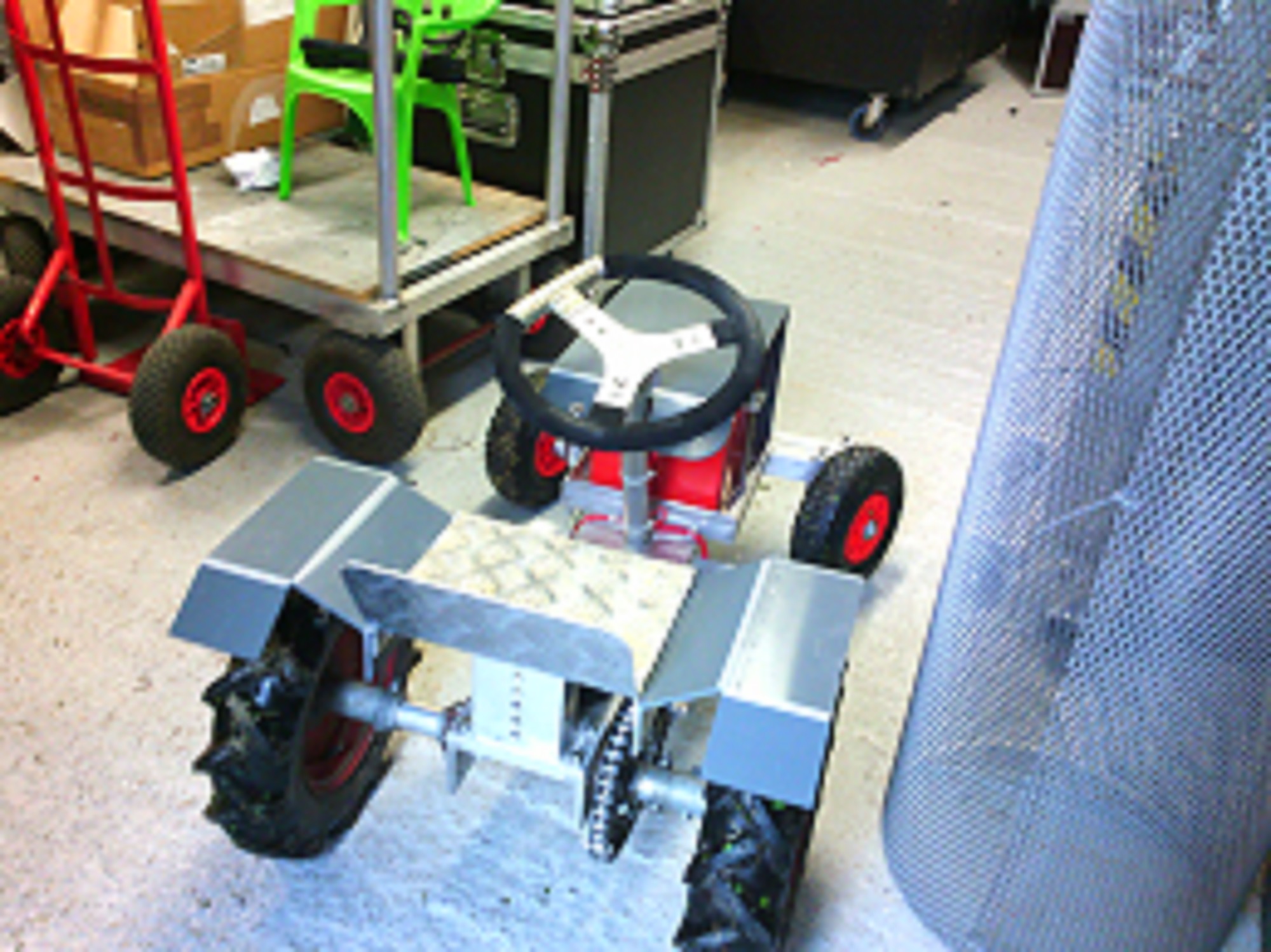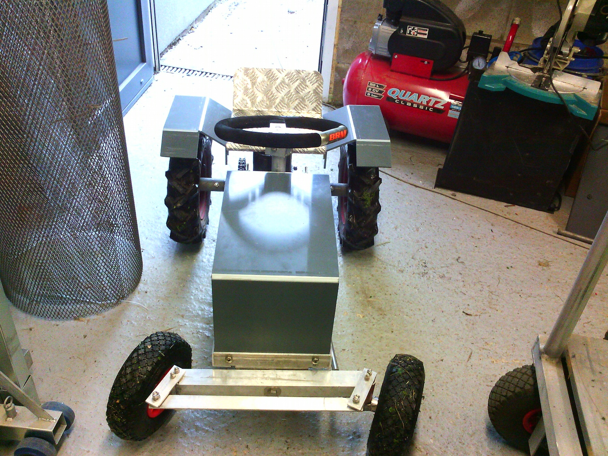 j ai utiliser un moteur d essuie glace de bus , roue ar de motoculteur , av de diable , tout est fait en allu et visserie inox , garde boue et capot en pvc