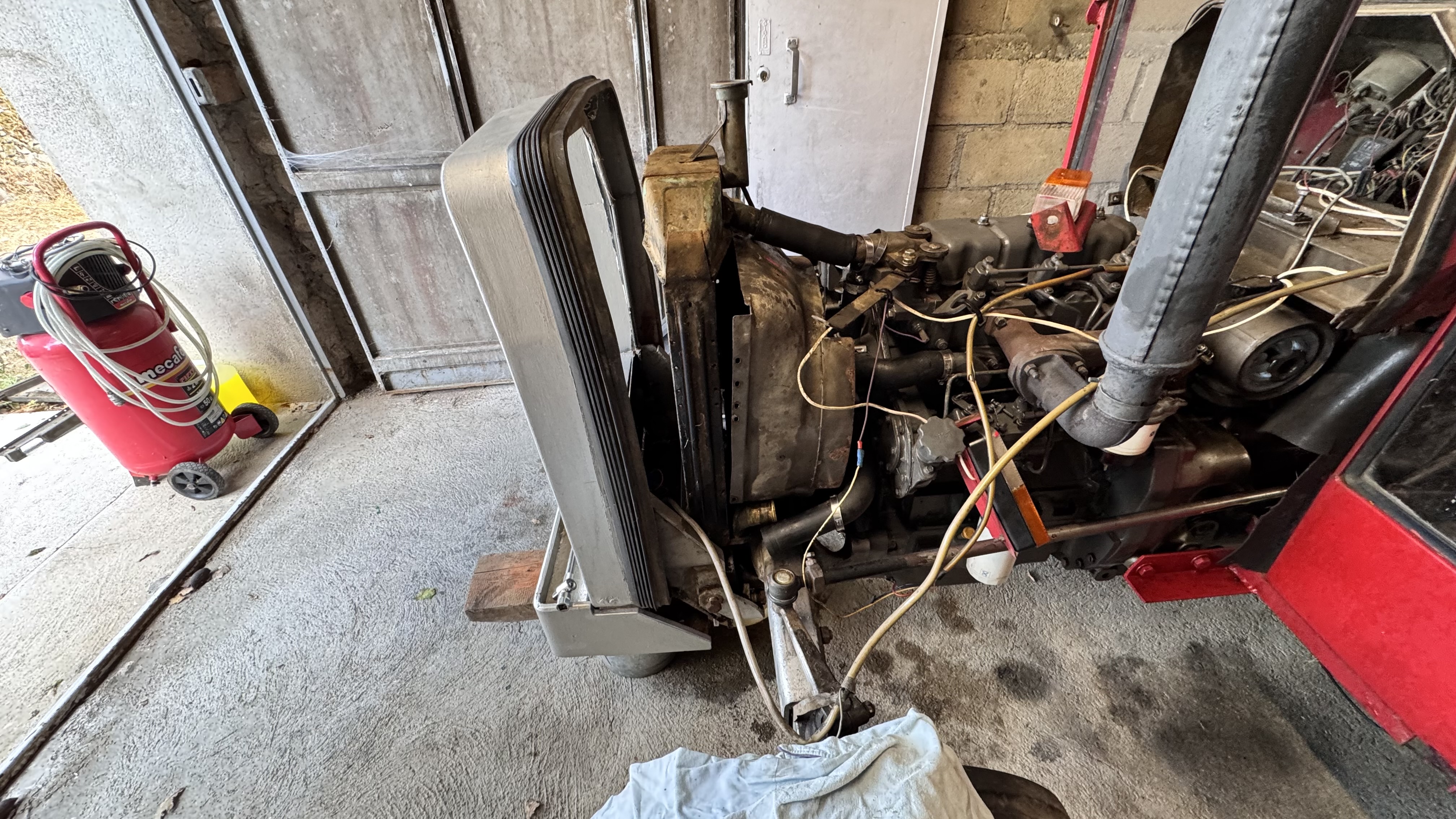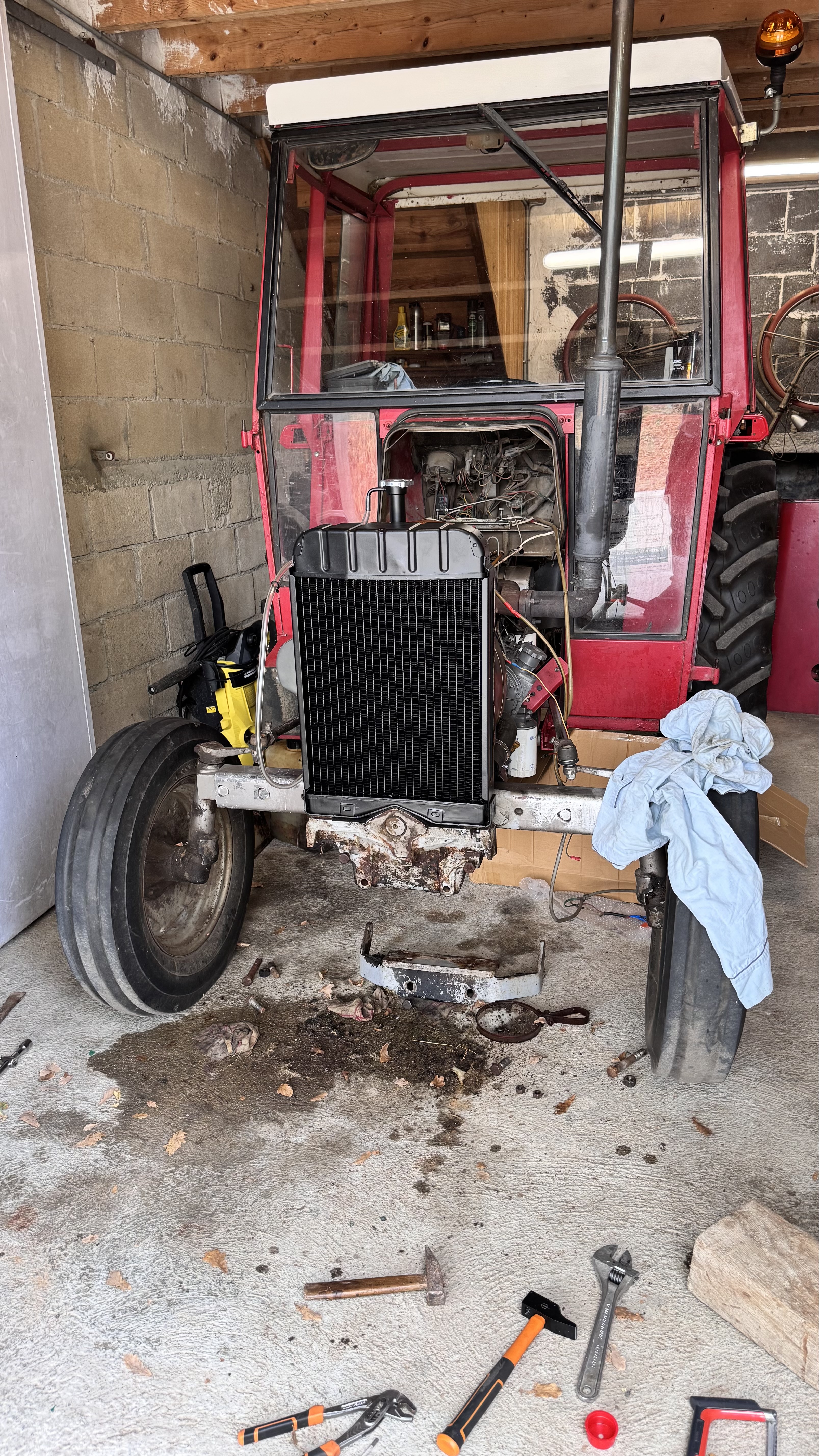 J ai voulu remplacer le radiateur de mon 235 qui suintait. La doc technique dit qu il faut dévisser les 2 écrous qui le retiennent par en dessous…je voyais le truc bouclé en 2 h…hélas pas si simple !