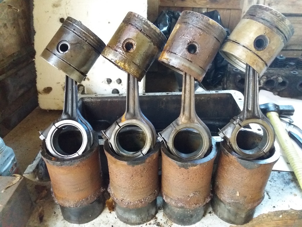 Après quelques semaines je me suis enfin remis sur le tracteur, vu la position du vilebrequin je n'ai pu déposer que les chapeaux de bielle des cylindres 2 et 3 mais cela a suffit en bougeant le tracteur d'avant en arrière avec la 4ième enclenchée à faire tourner le vilebrequin, eurêka ! J'ai donc pu sortir par le dessus les ensembles piston/bielle des cylindres 2 et 3 puis placer le vilebrequin convenablement pour extraire les chapeaux de bielle des cylindres 1 et 4 et sortir les ensembles piston/bielle de ces mêmes cylindres.