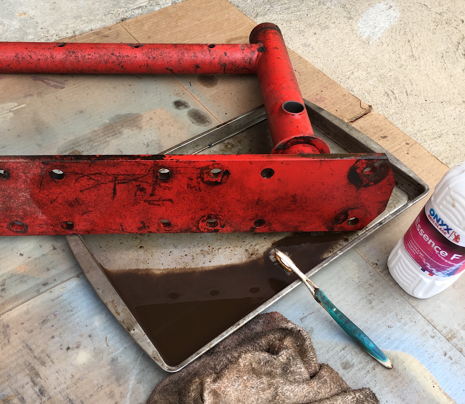 Le bâti mobile maintenant: gros dégraissage (y avait la dose de graisse, mais du coup, pas de rouille! :shock: ), décapage énergique à la toile émerie, friction à l'acétone, puis peinture. En effet, ça fait neuf.