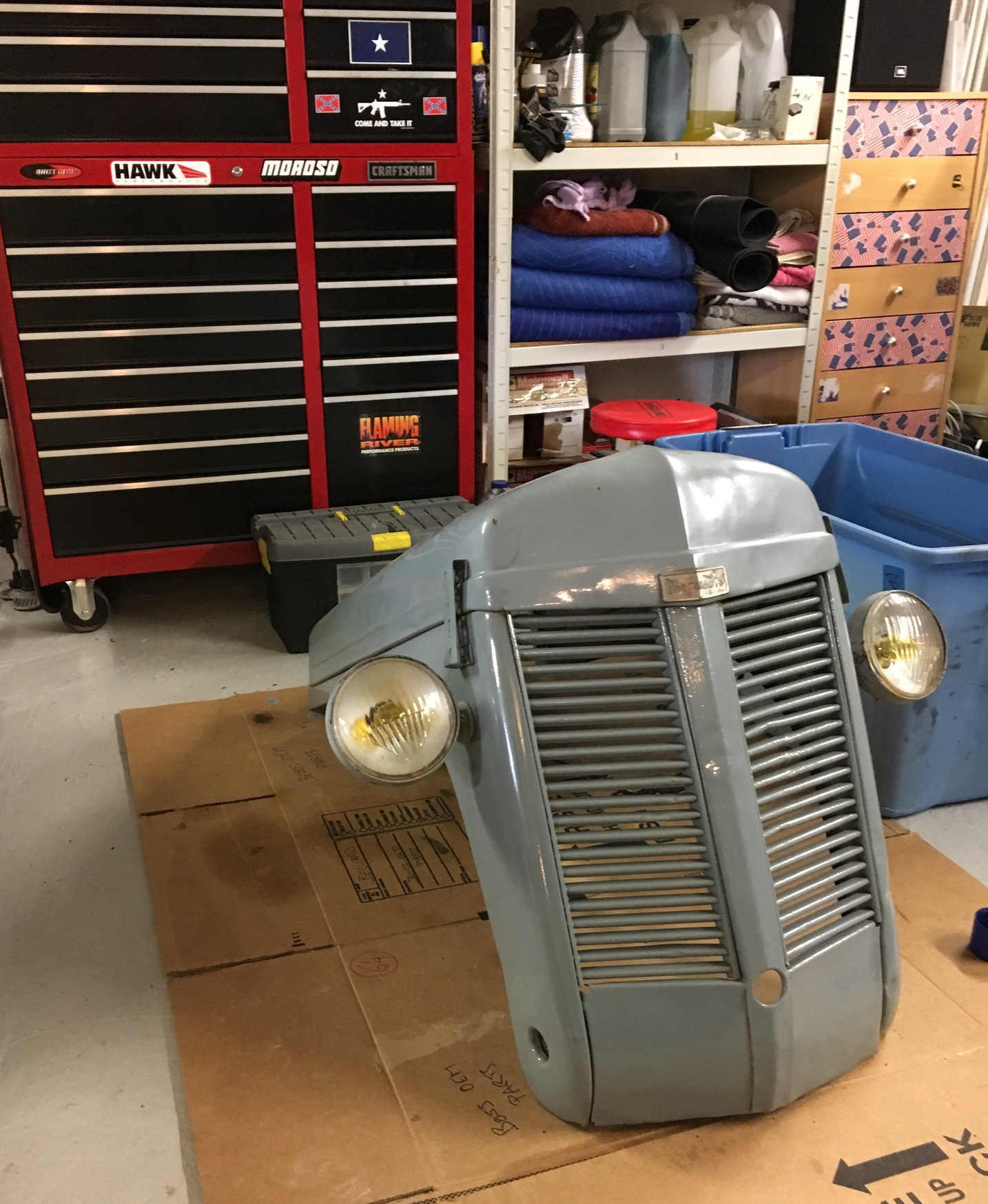 Et du coup, j'ai décidé de repeindre le capot, de restaurer les phares, la petite plaque Ferguson, etc. Le faisceau électrique pour l'ensemble de l'éclairage de la machine va suivre. Donc au garage pour démontage, ponçage en règle et mise en peinture. J'ai toujours aimé le modélisme!