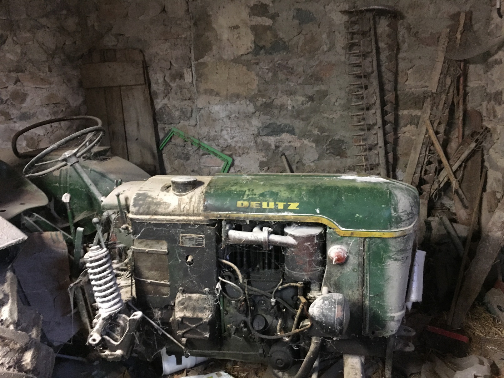 En arrivant à la ferme plus haut, je suis tombé sur l'agriculteur qui y vit. Il fendait du bois au cul d'un Deutz des années 70 (j'ai pas pensé à prendre de photo...) Lorsqu'il a vu mon "dragster", il m'a fait signe et je me suis arrêté. Nous avons discuté un petit moment, puis il me dit qu'il a encore le tracteur de son grand-père au fond de la grange. Un autre Deutz, de 1957 celui-là, et me propose de me le montrer. Et là, c'est que du bonheur! L'engin n'a pas tourné depuis 3 ans, mais tout y est, la charrue, la barre de coupe, c'est magnifique...