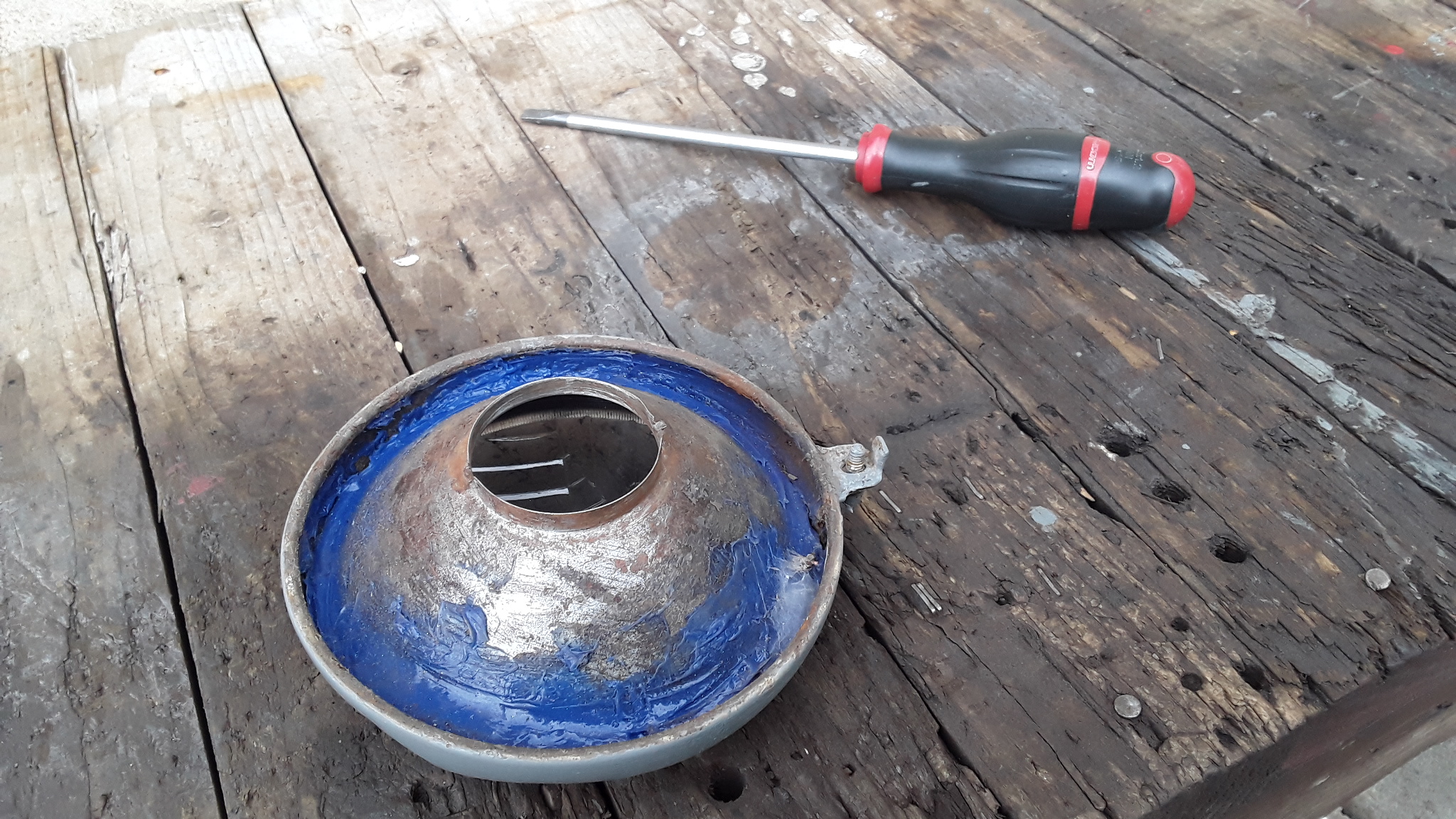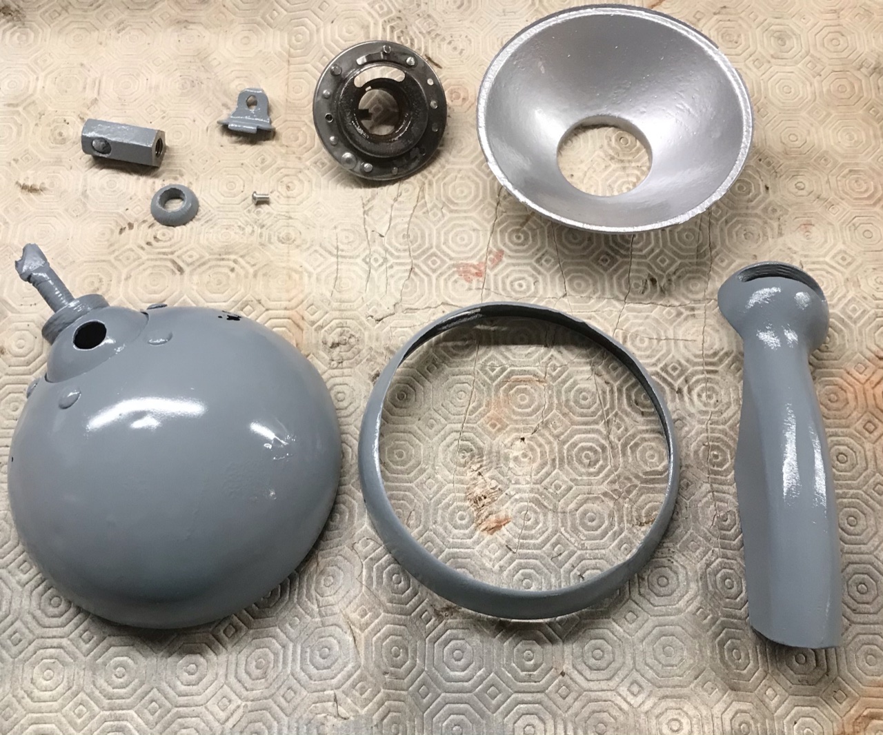 Bravo pour ton phare, vite remis en état... Si je puis me permettre pour avoir eu le même souci de perforation au niveau du "bol", j'ai opéré une réparation par l'intérieur avec de la toile et de la résine polyester puis léger enduit de lissage sur l’extérieur avant peinture. Comme toi j'ai utilisé de la peinture aspect chrome pour la parabole, le rendu est plutôt teinte aluminium... Cela le fait quand même car ce phare est plutôt pour le décor que pour son utilité (je ne travaille pas au,noir...)