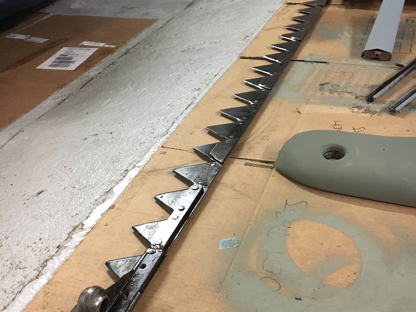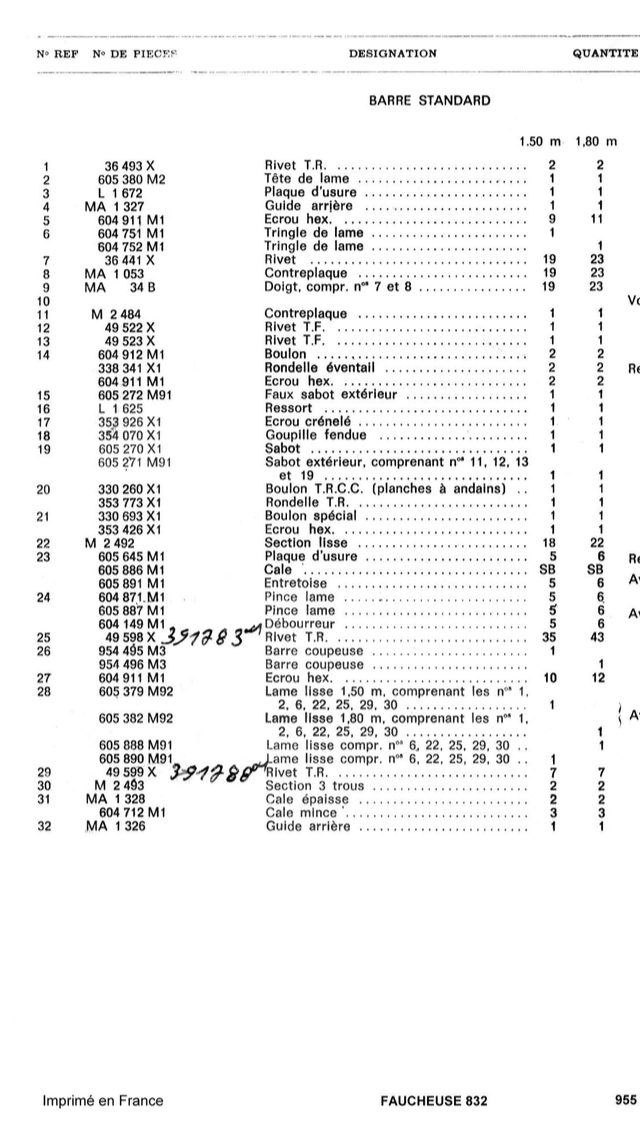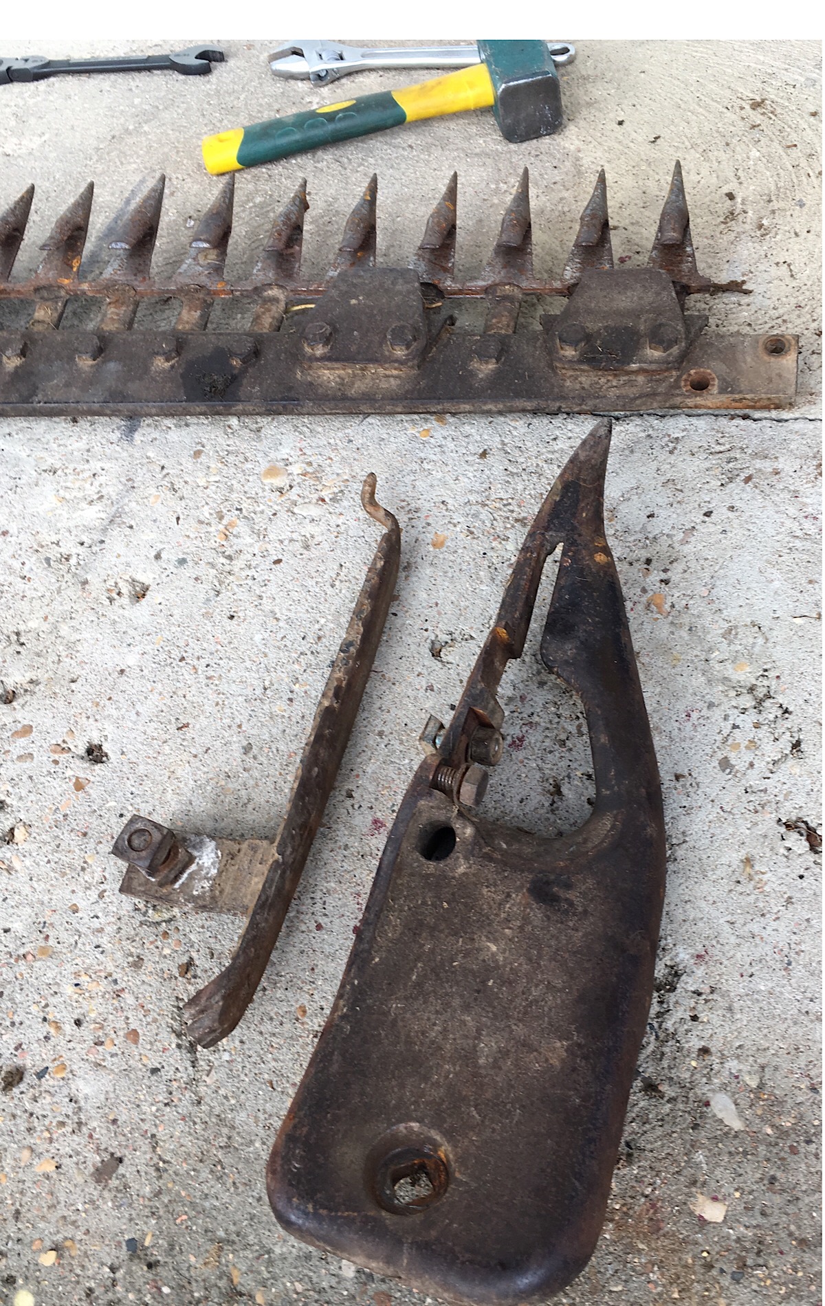 Sinon, après avoir ôté les restes d’herbe et de terre séchée, bien décapé la rouille de surface et huilé la lame, elle retrouve facilement son aspect d’outil entretenu. C’est un boulot plaisant à faire. On retrouve bien les sections à 2 trous estampillées M 2492 et celles à 3 trous, qui portent la référence M 2493. C’est conforme au catalogue de pièces détachées. Bon là, c’est le bazar, avec de la 3 trous un peu partout, et une 2 trous là où pourraient aller 3 rivets... Va falloir remettre tout ça en ordre! lol