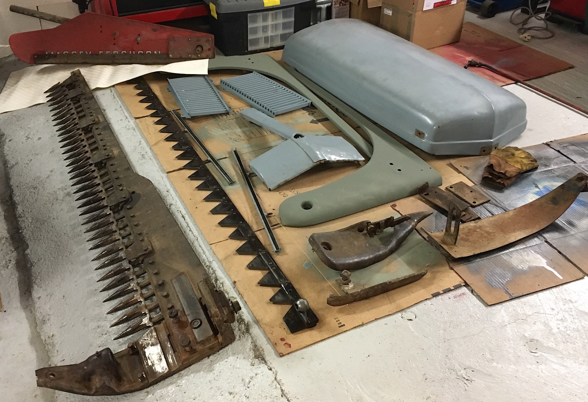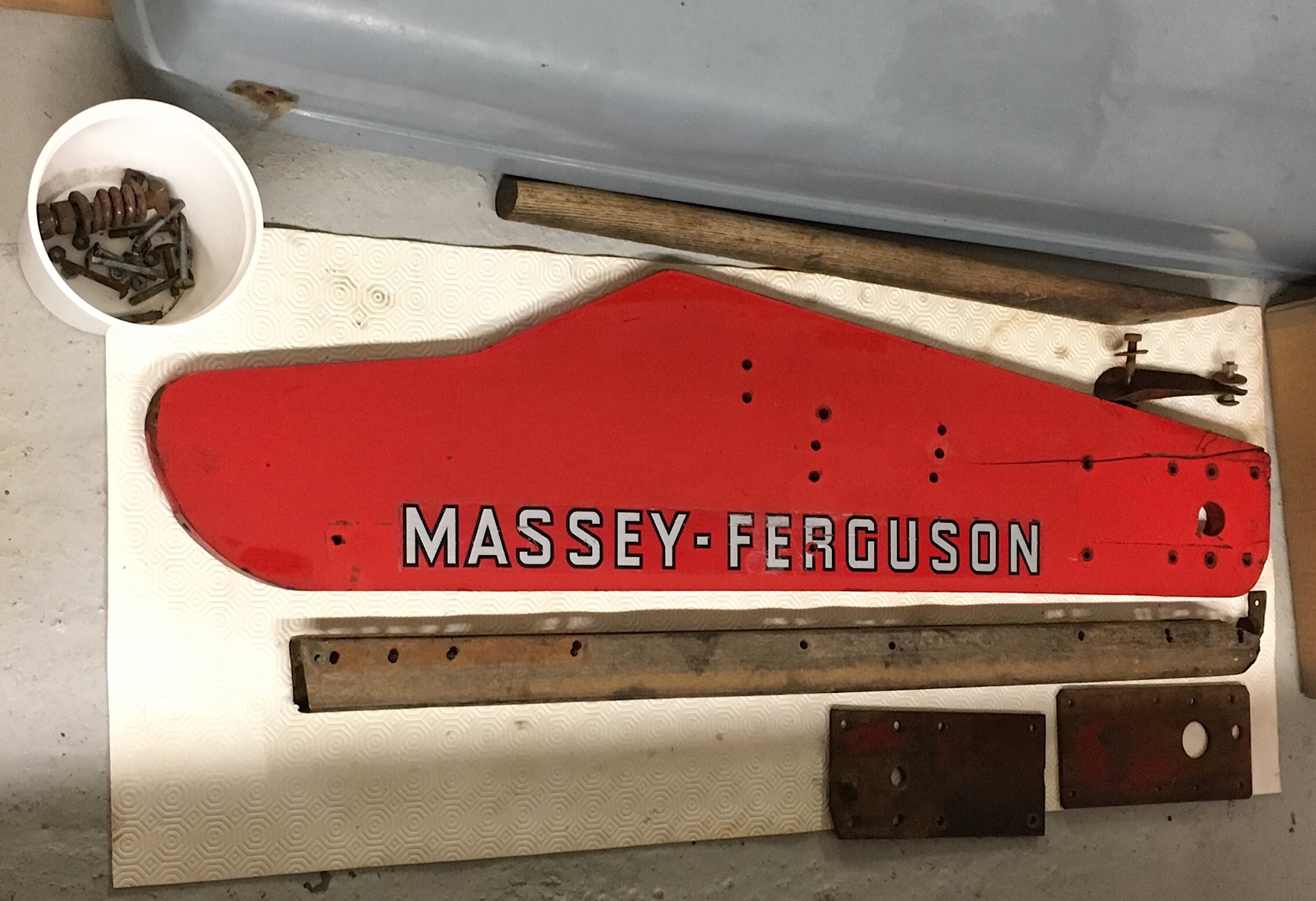 Démontage et nettoyage de la planche à andain. C’est chouette, elle est restée en bon état. Pareil, remplacement de la visserie et décapage/peinture des pièces métalliques à suivre.