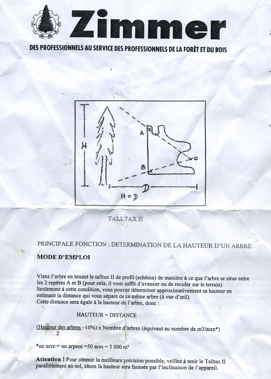 C'est un petit outil finlandais dont voici la photo , ainsi que le mode d'emploi très sommaire. ( le mode d'emploi en finlandais fait plusieurs pages, car cette appareil permet aussi d'estimer très rapidement tous les arbres sir 360 degrés dépassant une certaine hauteur)