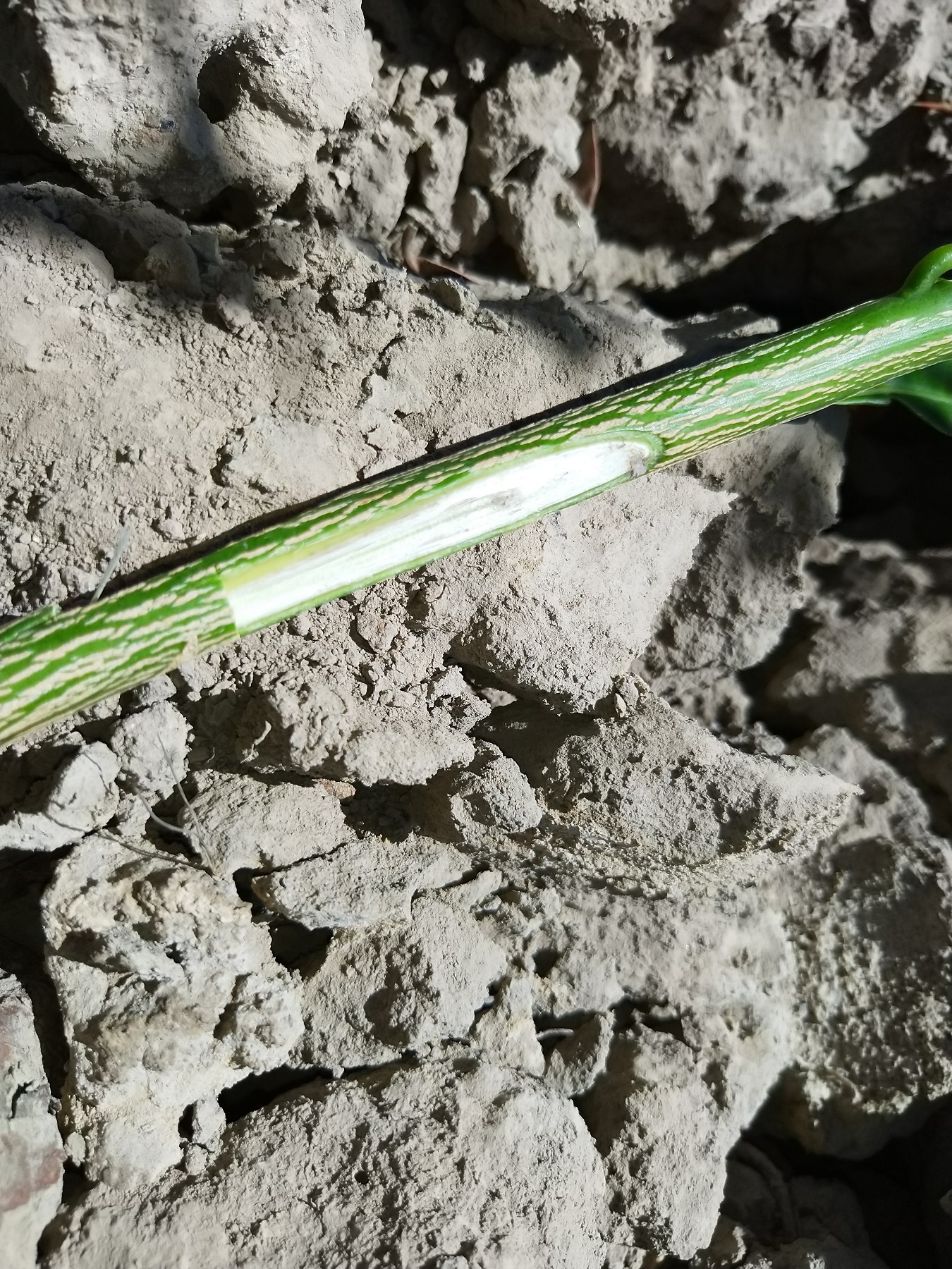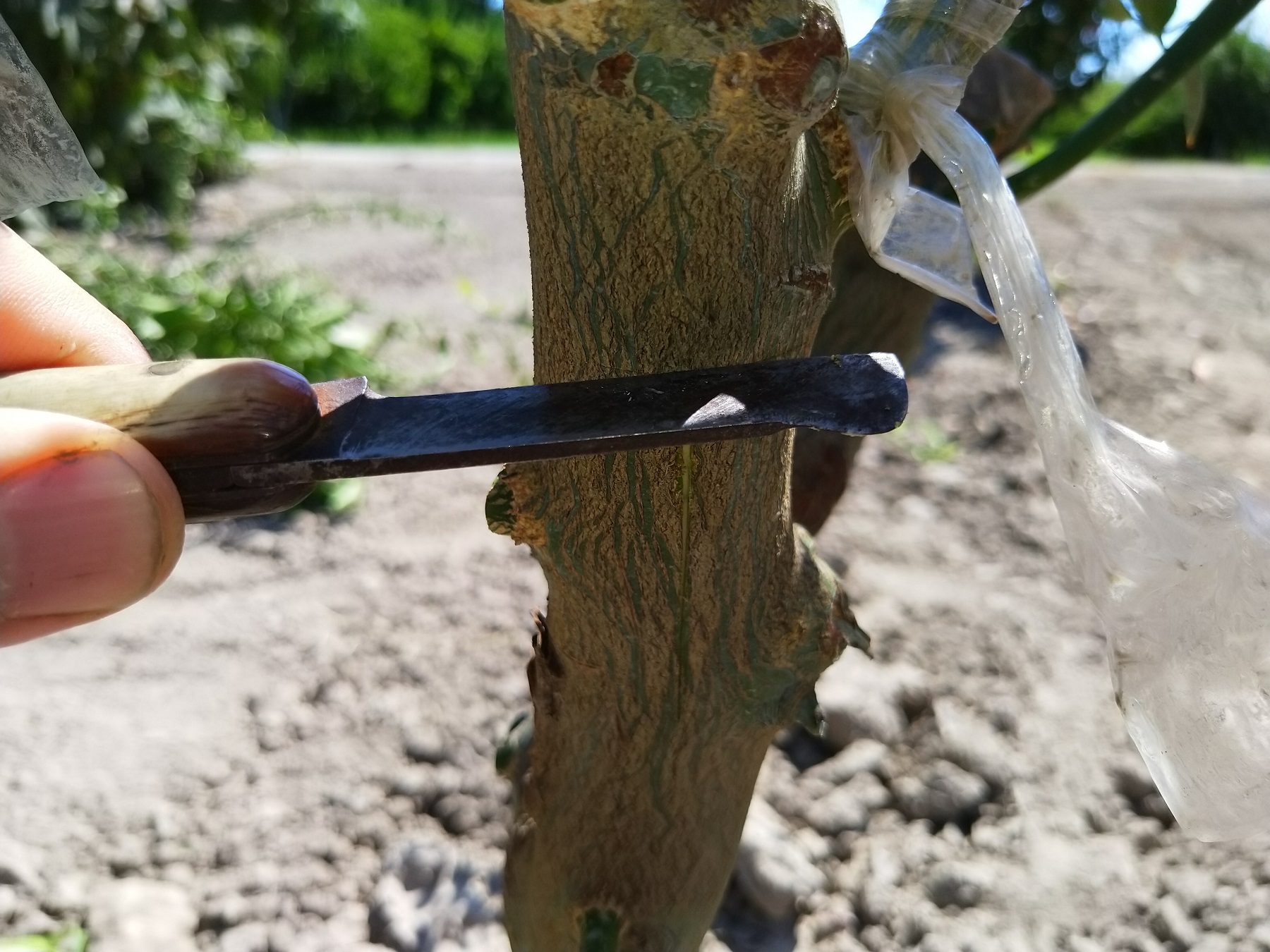 Ensuite avec le greffoir j'ai fait une incision en T pour pouvoir glisser l'oeil de l'oranger a l'intérieur