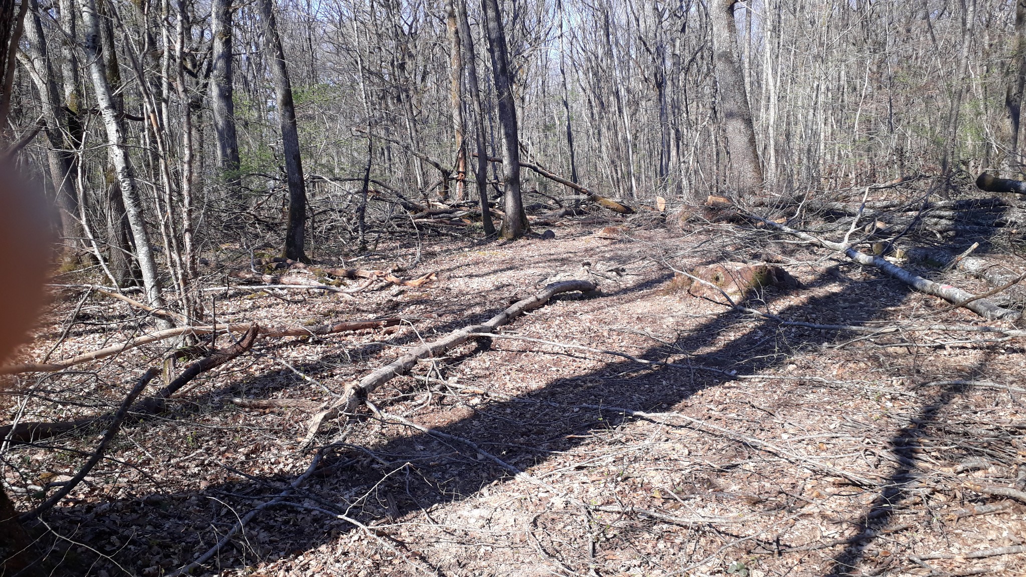 Vue du chemin fait par le debardage ! Il y en a partout, souches coupé à 40cm du sol. Charmes de 15 cm couchés au milieu du passage. Entre celui qui a abatu et l'autre qui a debardé, c'est pas du bon boulot. :( Passé plus d'1 journée a débarrasser les chemins pour accéder aux 3 parcelles.