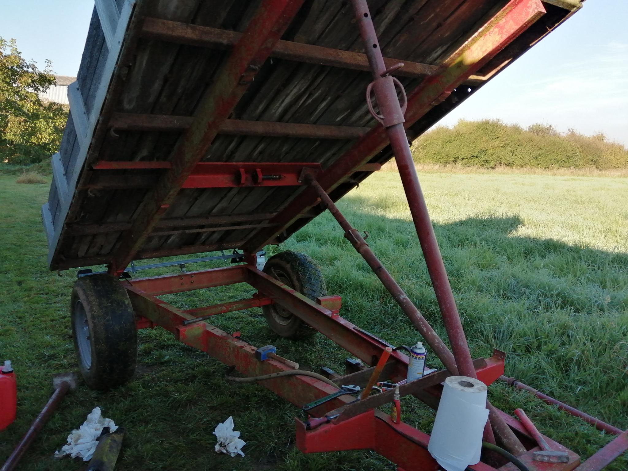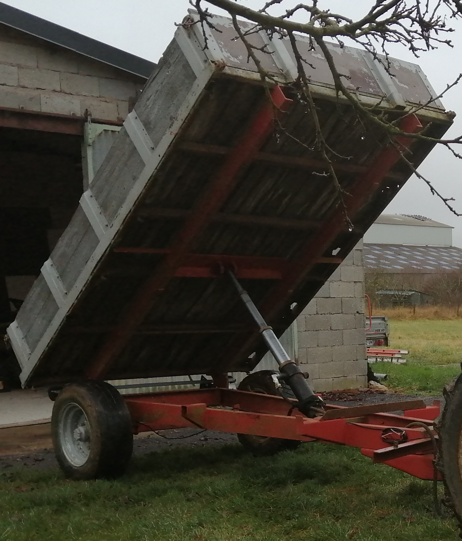 Voilà une photo de la remorque Massey Ferguson 837 qui va également avoir droit à une restauration, il n'y a plus le système de freinage, j'ai trouvé une poignée de frein d'occasion.