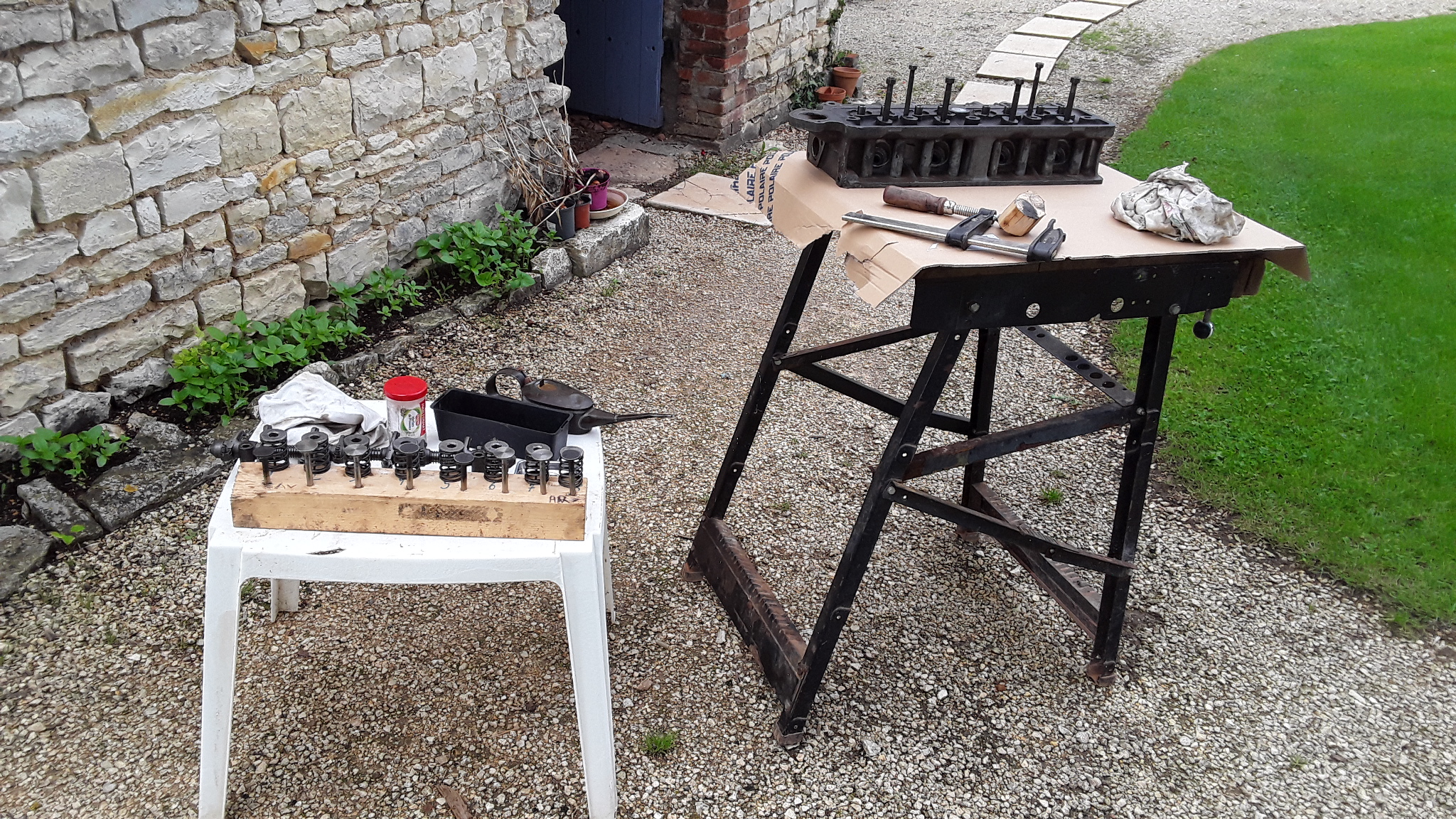 Ça a avancé dans la préparation du bas moteur et culasse. J'ai nettoyé les pistons et le plan de joint, j'ai fini la culasse, rodage des soupapes, vérifier la planeité, pas de problème de ce côté, pas de défaut visible à la reglette. Je suis à l'extérieur, donc pour le remontage oups ! pas très beau cette semaine.
