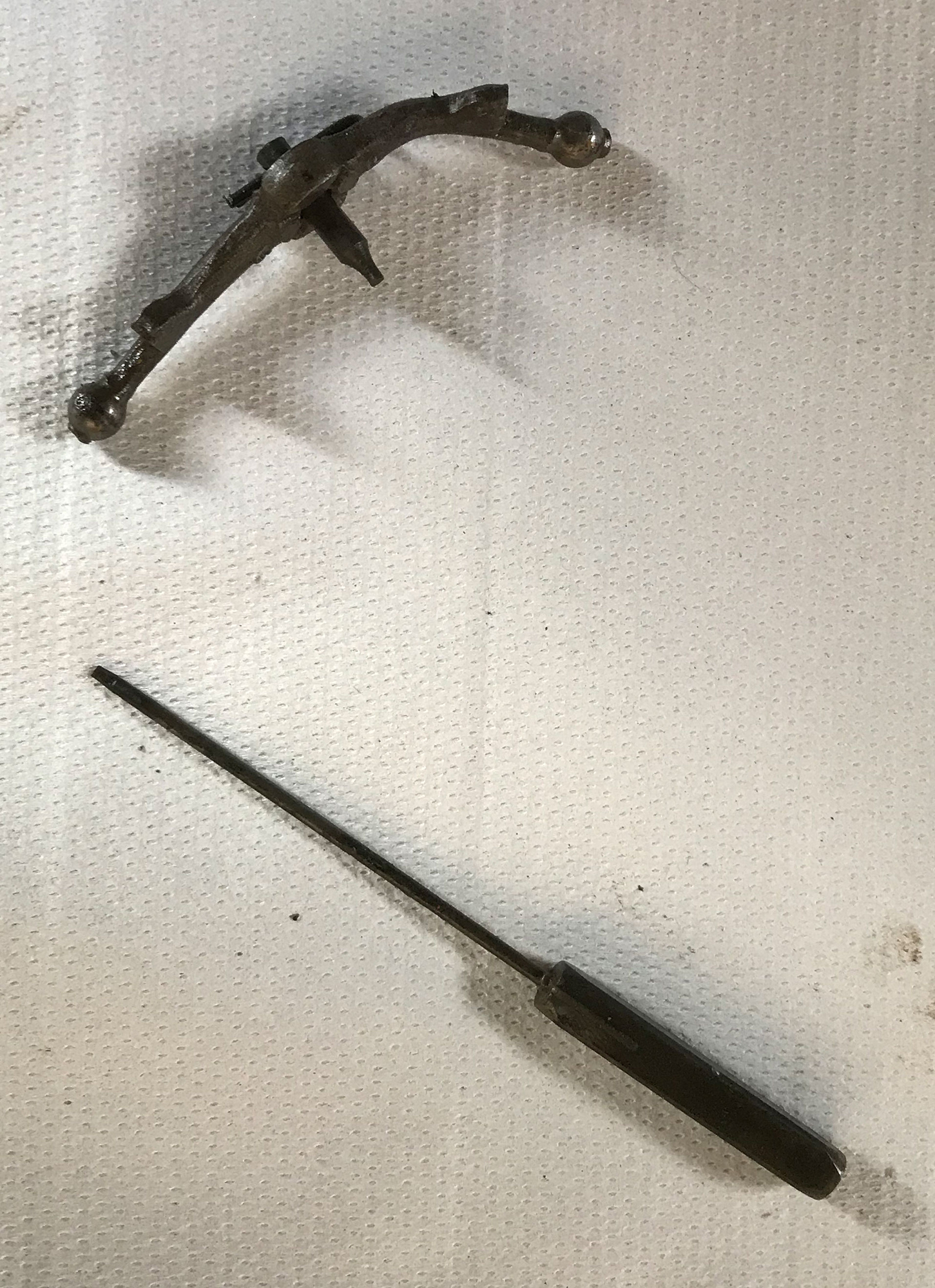 De plus la partie fixée à cette tige (pièce métallique terminée par deux boules et qui vient de prendre dans la fourchette de commande hydraulique) est tordue. Il va me falloir la redresse sans la casser. Cette pièce, je ne l'ai jamais vu sur aucun site de vente de pièces. Croisons les doigts....