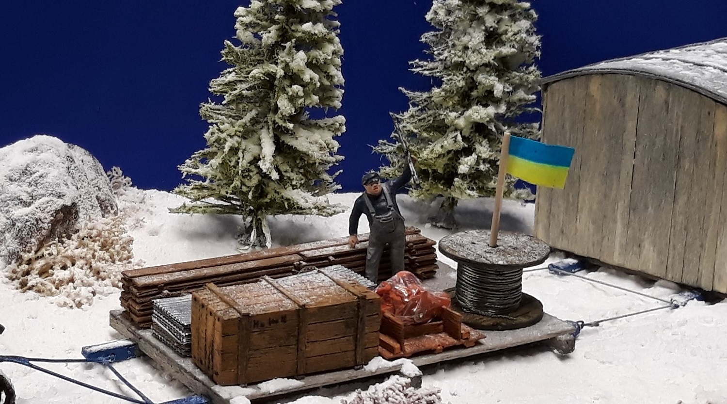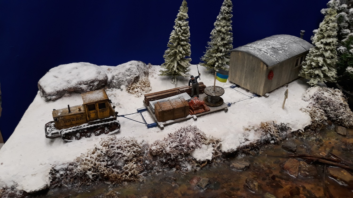 Très bel ensemble, je crois que tu nous a déjà présenté ce tracteur chenillé, la cabane et le traîneau de matériel vont bien avec le décor et le tracteur tout a bien sa place.