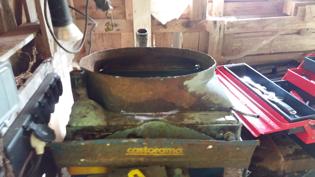 A priori la genèse de la casse est la suivante : fuite d'eau, remplissage d'eau à plusieurs reprises, blocage du moteur, puis stockage pendant quelques années. Le bon sens fait penser à une fuite d'eau vers l'huile moteur puis à un serrage d'un ou plusieurs piston lorsque l'huile a perdu trop des ses capacités lubrifiantes. Déblocage du moteur impossible à la poussette et à la manivelle, idem démarreur déposé, donc probablement au moins un piston serré mais une chose que j'ai appris en restauration moto : "pas de suppositions, uniquement des faits" donc on verra au démontage.