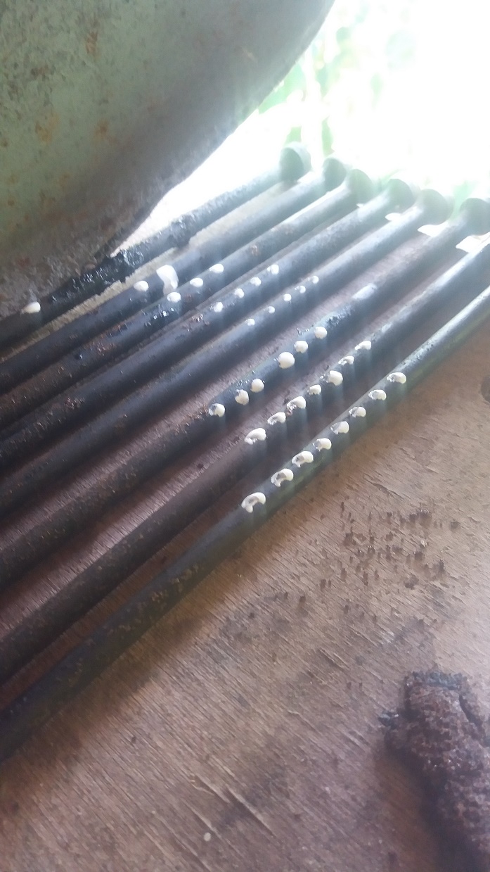 En récupère ensuite les 8 tiges de culbuteurs, attention parfois le poussoir vient avec, pas de panique si il sort de son logement on peut le replacer une fois la culasse déposé. On numérote ensuite soigneusement les tiges pour les replacer chacune à leur place :