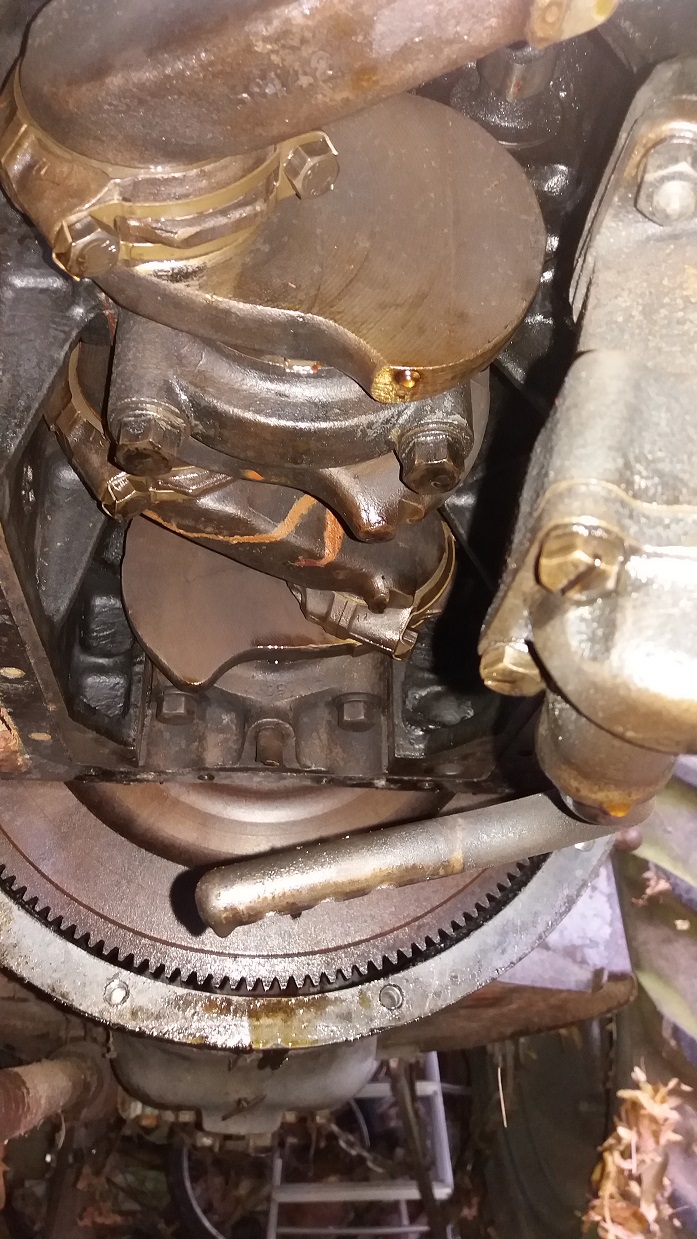 On va donc attaquer la désolidarisation des ensembles (chemise+piston+bielle) du vilebrequin. Pour ce faire j'ai déposé le carter moteur (en alliage à mon étonnement) et à mon prochain passage je dépose les chapeaux de bielles et essaie de sortir les ensemble chemise+piston+bielle.