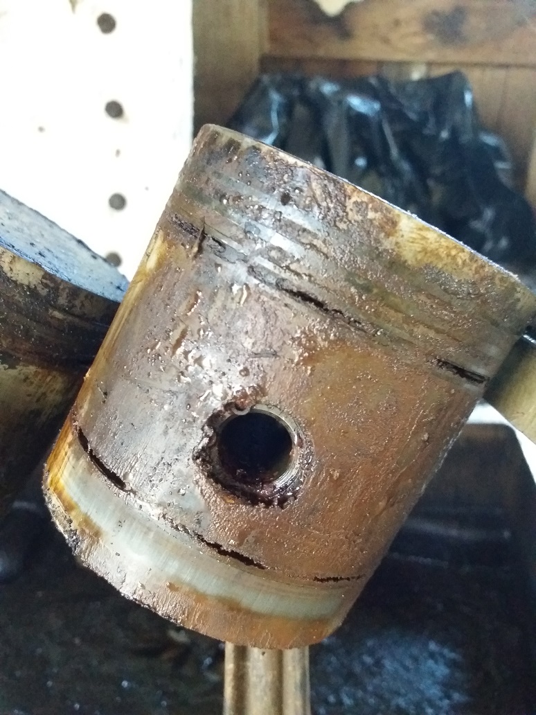 Après quelques semaines je me suis enfin remis sur le tracteur, vu la position du vilebrequin je n'ai pu déposer que les chapeaux de bielle des cylindres 2 et 3 mais cela a suffit en bougeant le tracteur d'avant en arrière avec la 4ième enclenchée à faire tourner le vilebrequin, eurêka ! J'ai donc pu sortir par le dessus les ensembles piston/bielle des cylindres 2 et 3 puis placer le vilebrequin convenablement pour extraire les chapeaux de bielle des cylindres 1 et 4 et sortir les ensembles piston/bielle de ces mêmes cylindres.