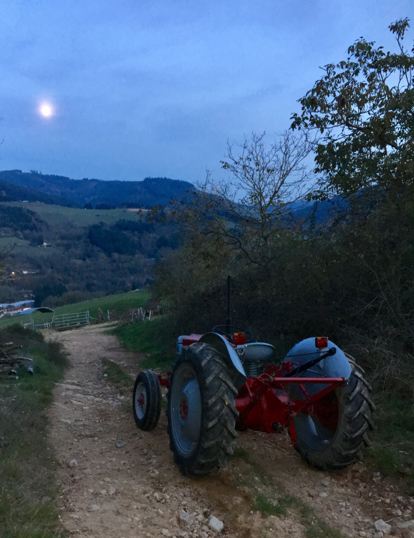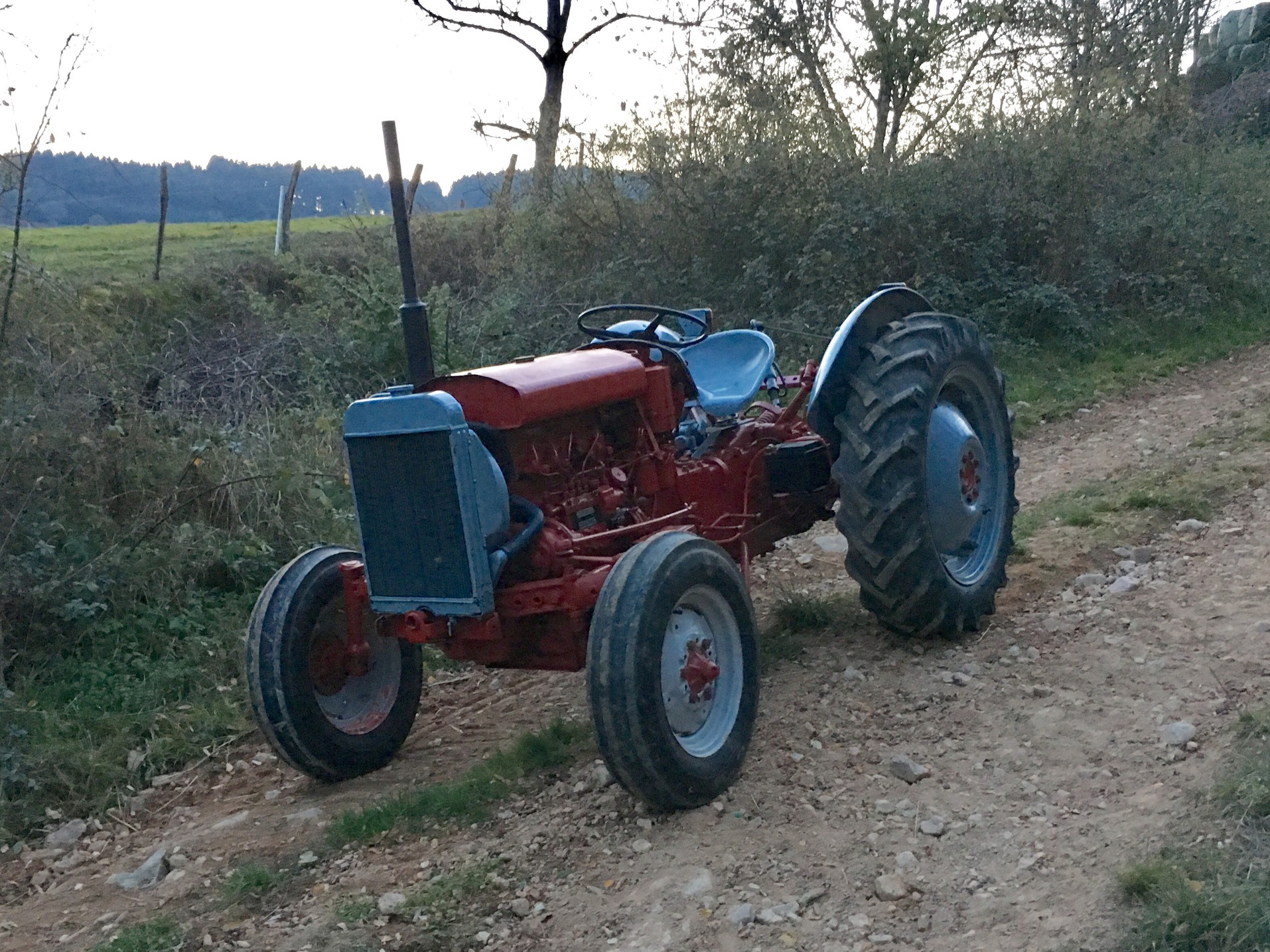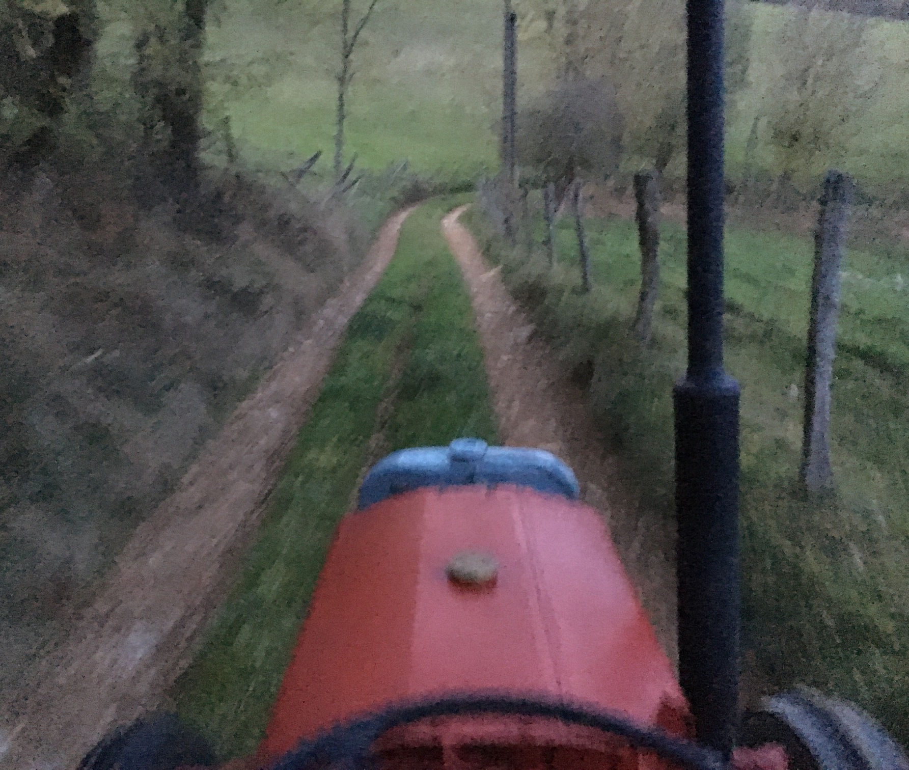 Et puis en fin de journée, j'ai décidé de partir en ballade. Je me sens plus à l'aise aux commandes de ce petit gris, donc cette fois, j'ai tenté la montée à la ferme du dessus par les chemins. Une bonne vingtaine de minutes en faisant bien gaffe aux ornières, car les engins d'aujourd'hui n'ont pas la même voie, et sont très lourds. Bilan, les ornières sont profondes et trop écartées pour le Ferguson. Faut être attentif!