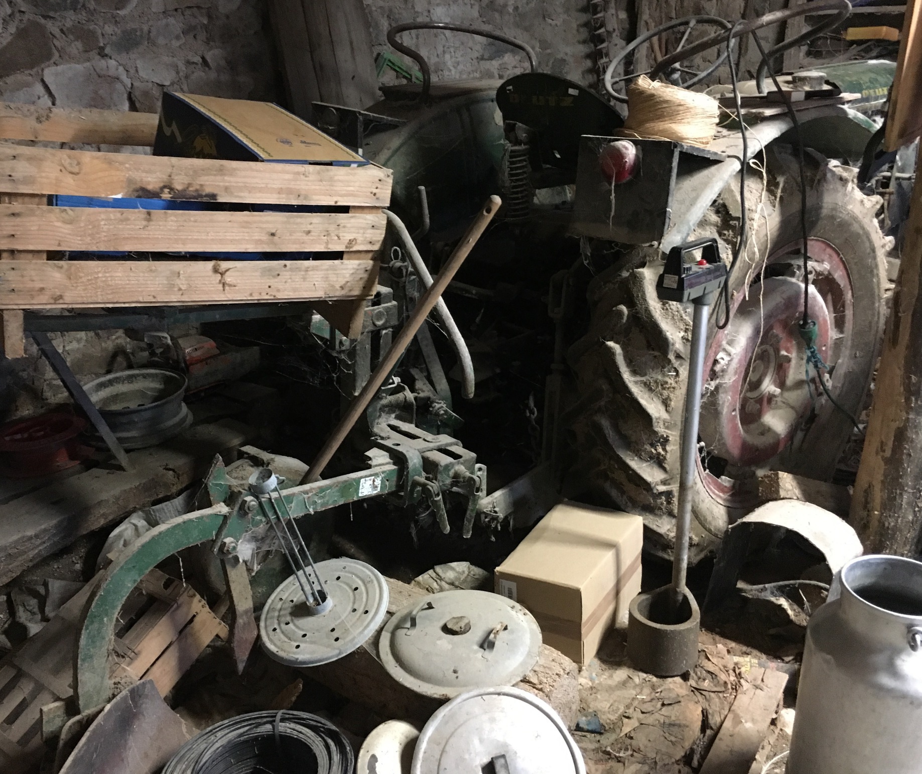 En arrivant à la ferme plus haut, je suis tombé sur l'agriculteur qui y vit. Il fendait du bois au cul d'un Deutz des années 70 (j'ai pas pensé à prendre de photo...) Lorsqu'il a vu mon "dragster", il m'a fait signe et je me suis arrêté. Nous avons discuté un petit moment, puis il me dit qu'il a encore le tracteur de son grand-père au fond de la grange. Un autre Deutz, de 1957 celui-là, et me propose de me le montrer. Et là, c'est que du bonheur! L'engin n'a pas tourné depuis 3 ans, mais tout y est, la charrue, la barre de coupe, c'est magnifique...