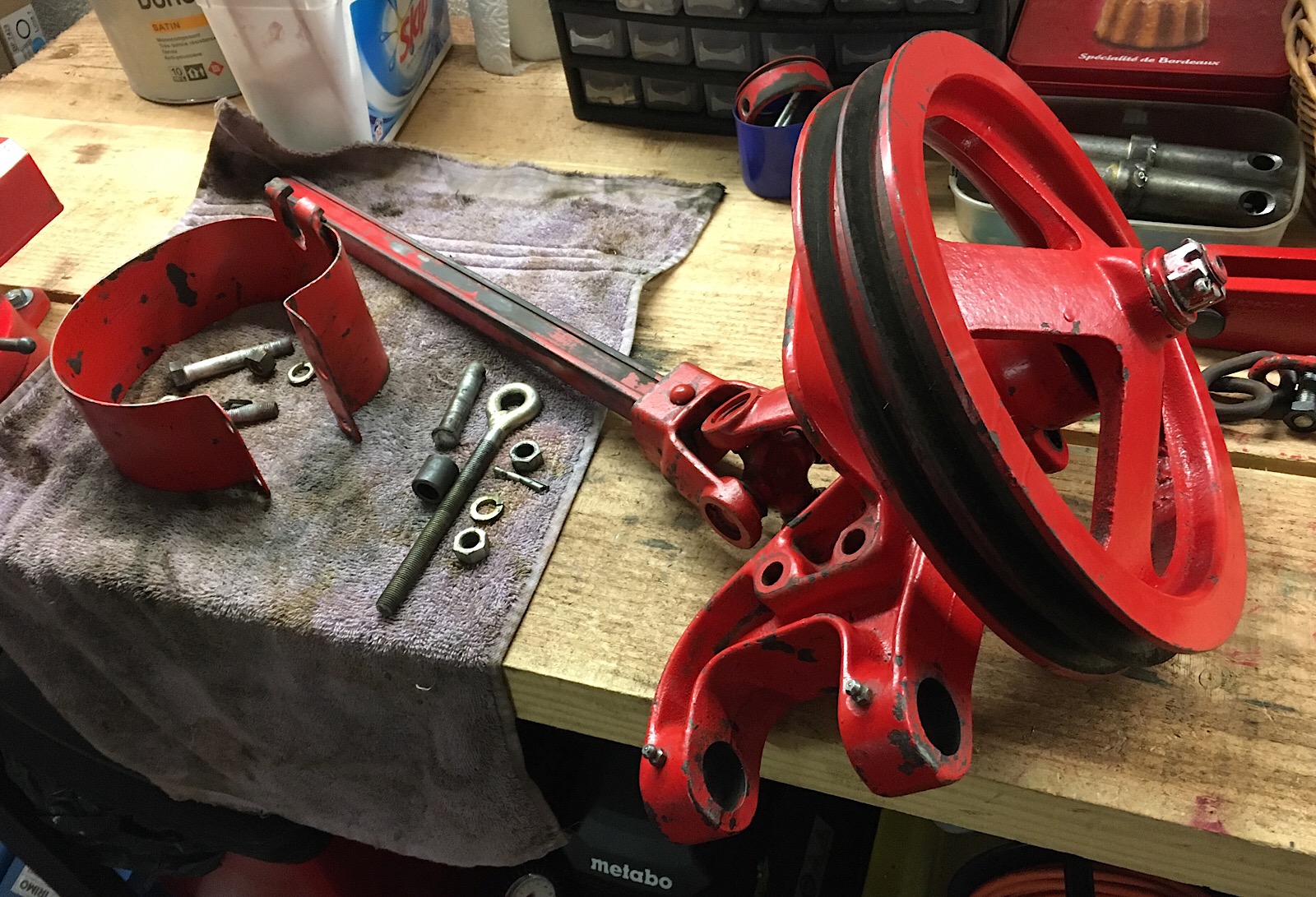 Le bâti mobile maintenant: gros dégraissage (y avait la dose de graisse, mais du coup, pas de rouille! ), décapage énergique à la toile émerie, friction à l'acétone, puis peinture. En effet, ça fait neuf.